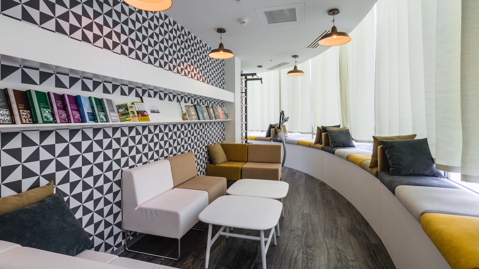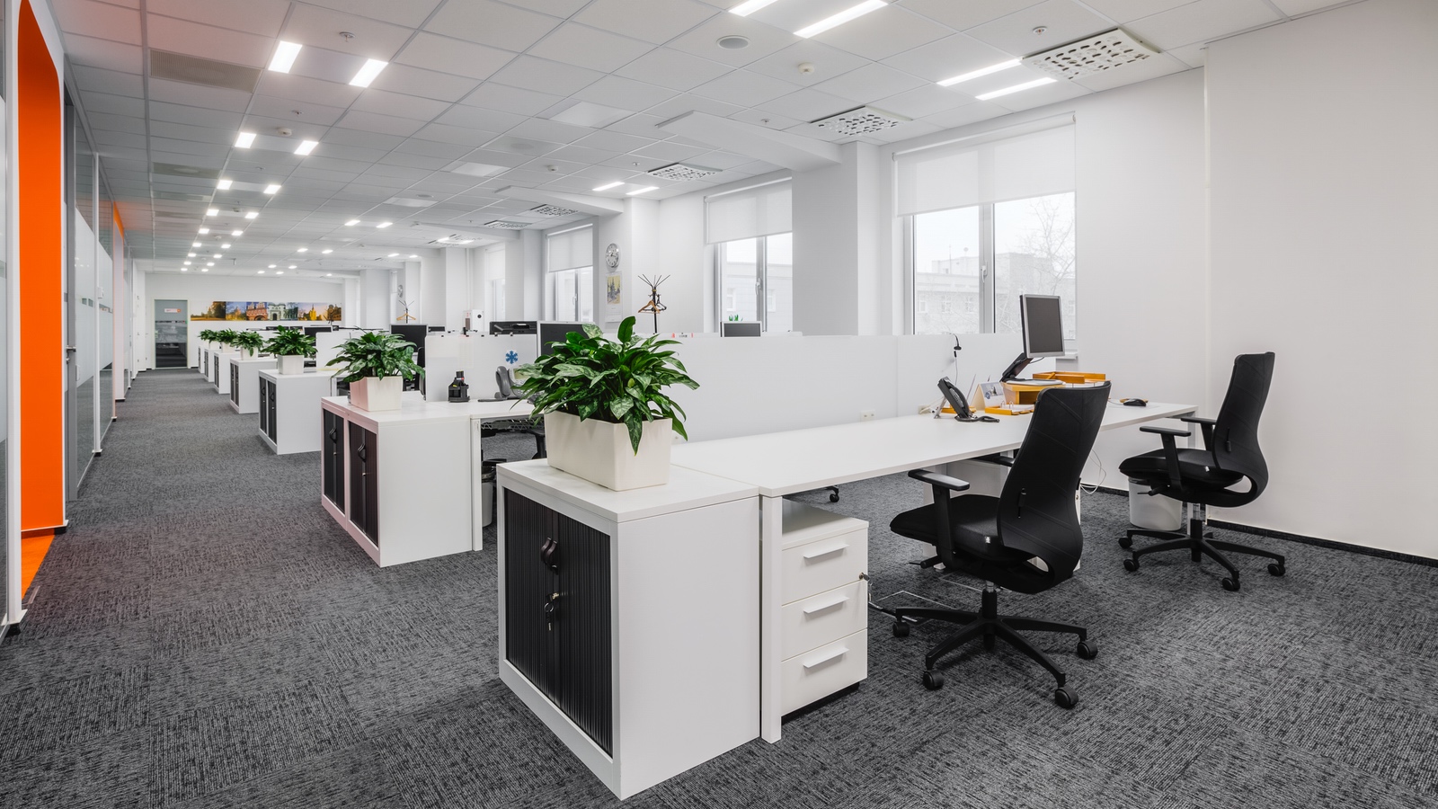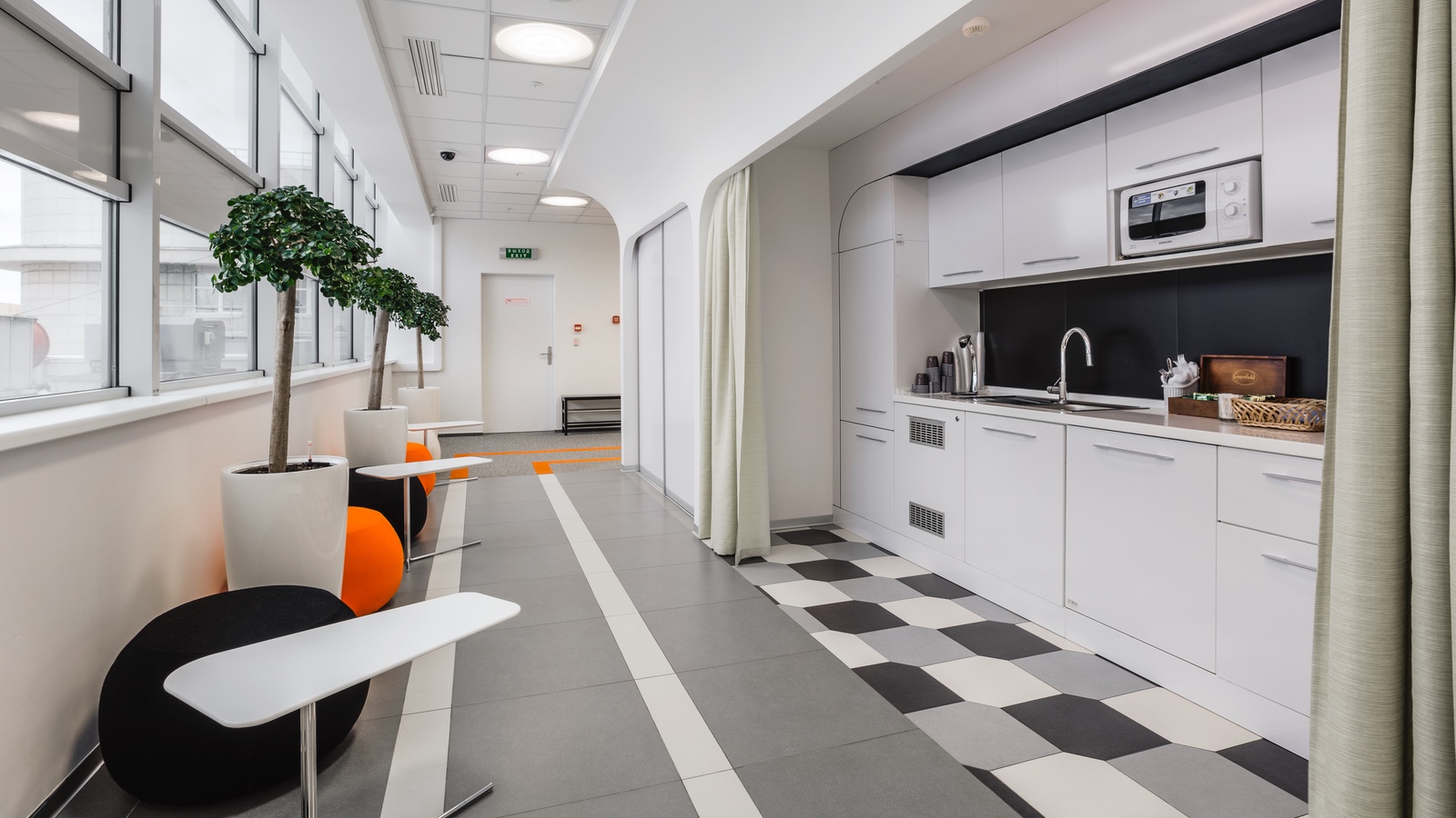 Grey has been selected as the primary color to use. At the same time, almost in all office premises, ranging from conference rooms and working areas to the kitchen, you can find a piece of decoration or furniture that is orange.