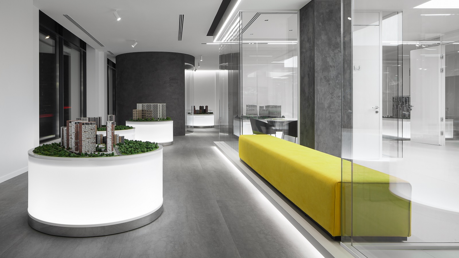 The client area presents miniature mockups of all housing estates of Ingrad. They are placed on bespoke illuminated expo-pedestals supplied by Concept. For the delivery of the largest pedestal into the office, fragments of the glass case were temporarily demounted.