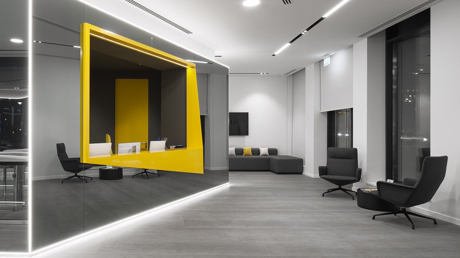 The giant «windows» of the reception desk and coffee-point, made of yellow artificial stone, are the spectacular central decorative elements of the client area. To decorate the fronts of high cabinets, painted MDF panels were used and ideally matched the color of the «windows». The comfortable waiting area has sofas and soft poufs of various shapes and dimensions. Comfortable meeting rooms are equipped with designed ergonomic furniture made in Europe. In addition to a large number of built-in furniture and sophisticated custom-made interior elements, furniture of European brands Andreu World, Pedrali, Narbutas, Cascando, is installed on the 1st floor.