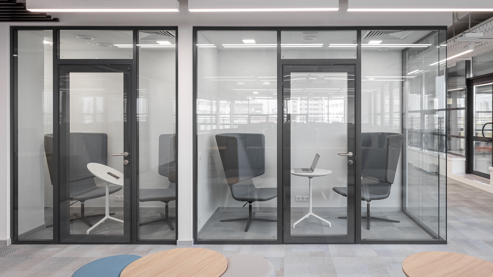 When developing the new office environment, high attention was focused to minimizing the background noise. To solve this problem, most of the workplaces are completed with sound-absorbing screens, as well as acoustic panels and partitions are used.