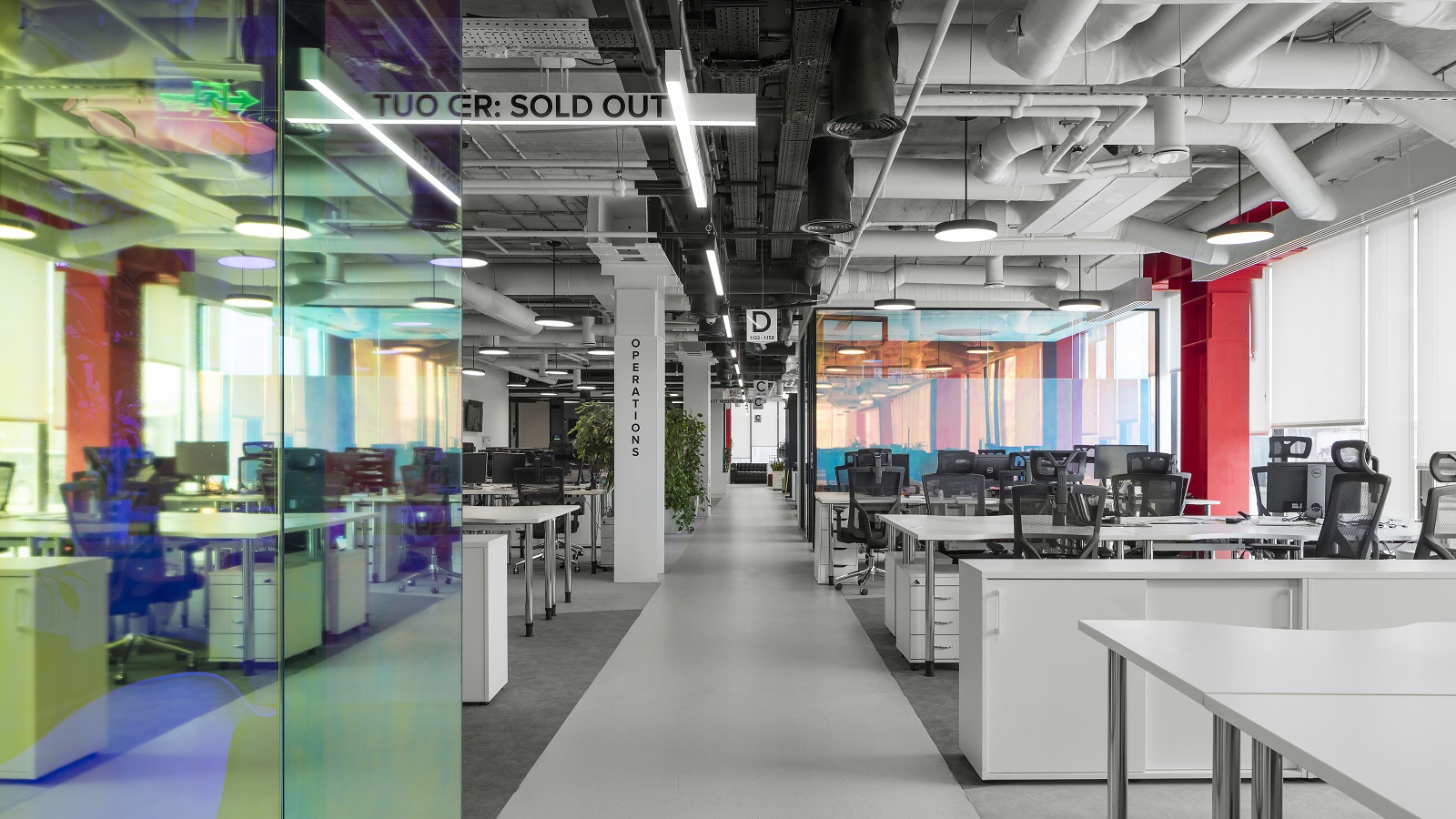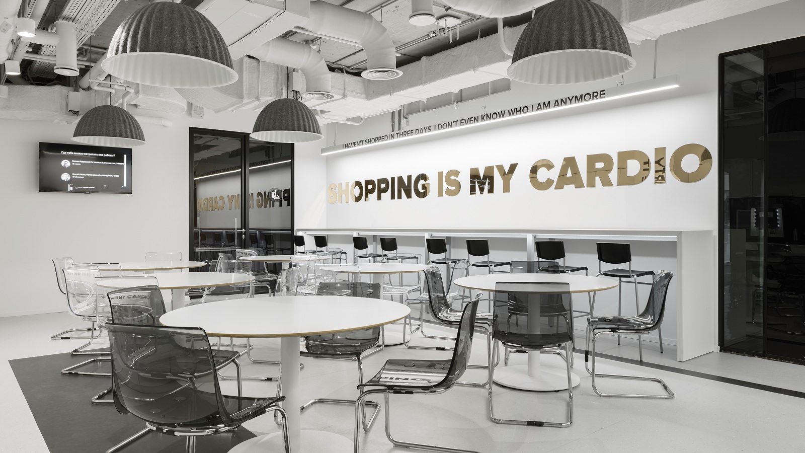 The architects from the IND architects bureau used a single minimalist style when creating design for all three floors of the office. Black and white colors prevail in the interior, while the glass partitions of the office are covered with mirror and decorative film, which creates an ever-changing dichroic color effect. The interior also includes neon lamps and inscriptions on the walls with quotes about fashion and lifestyle. The office has media walls that display company videos.