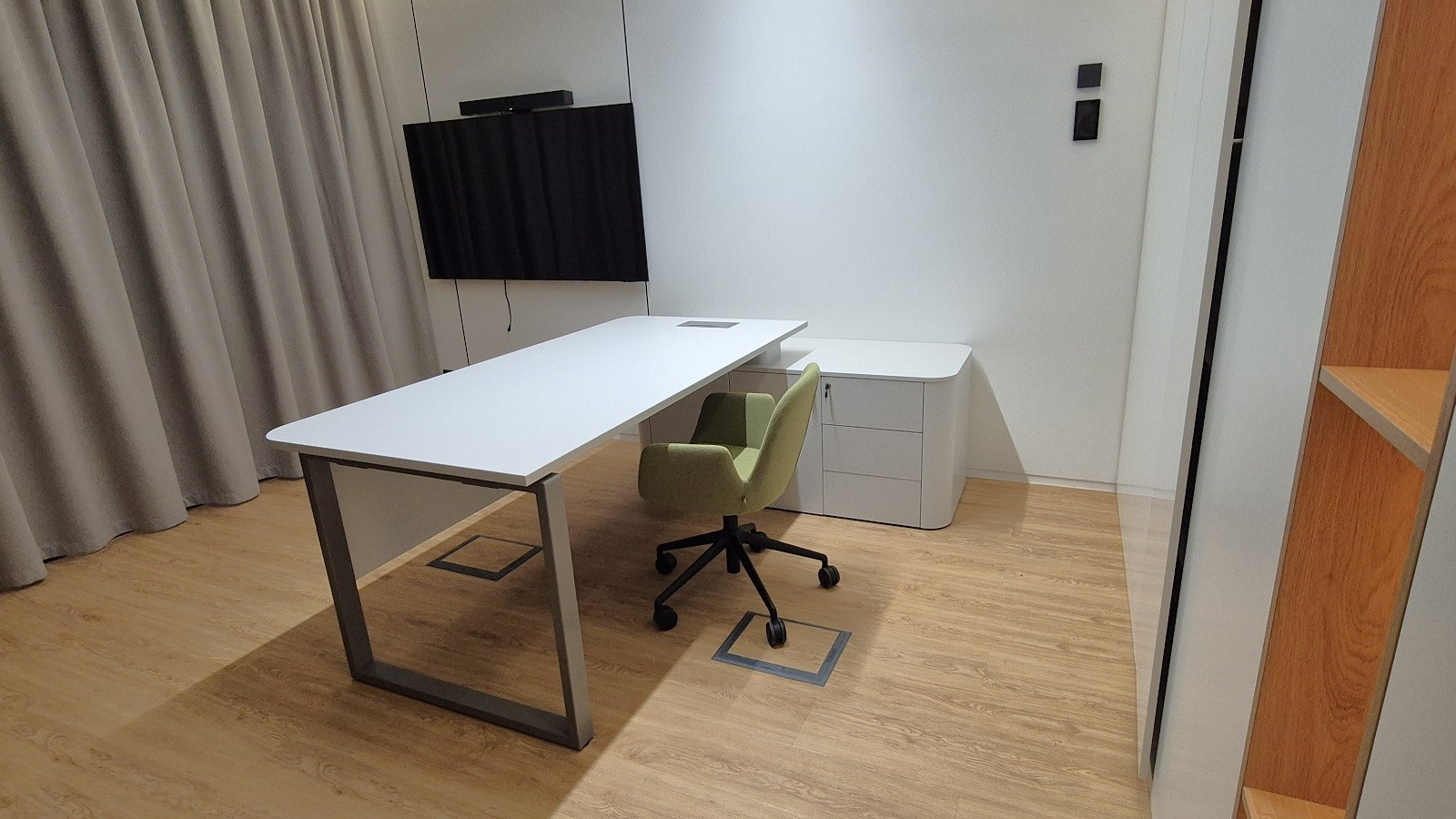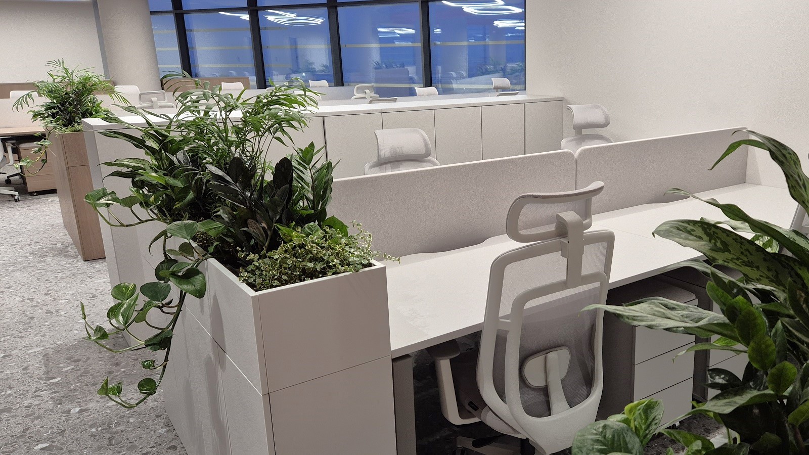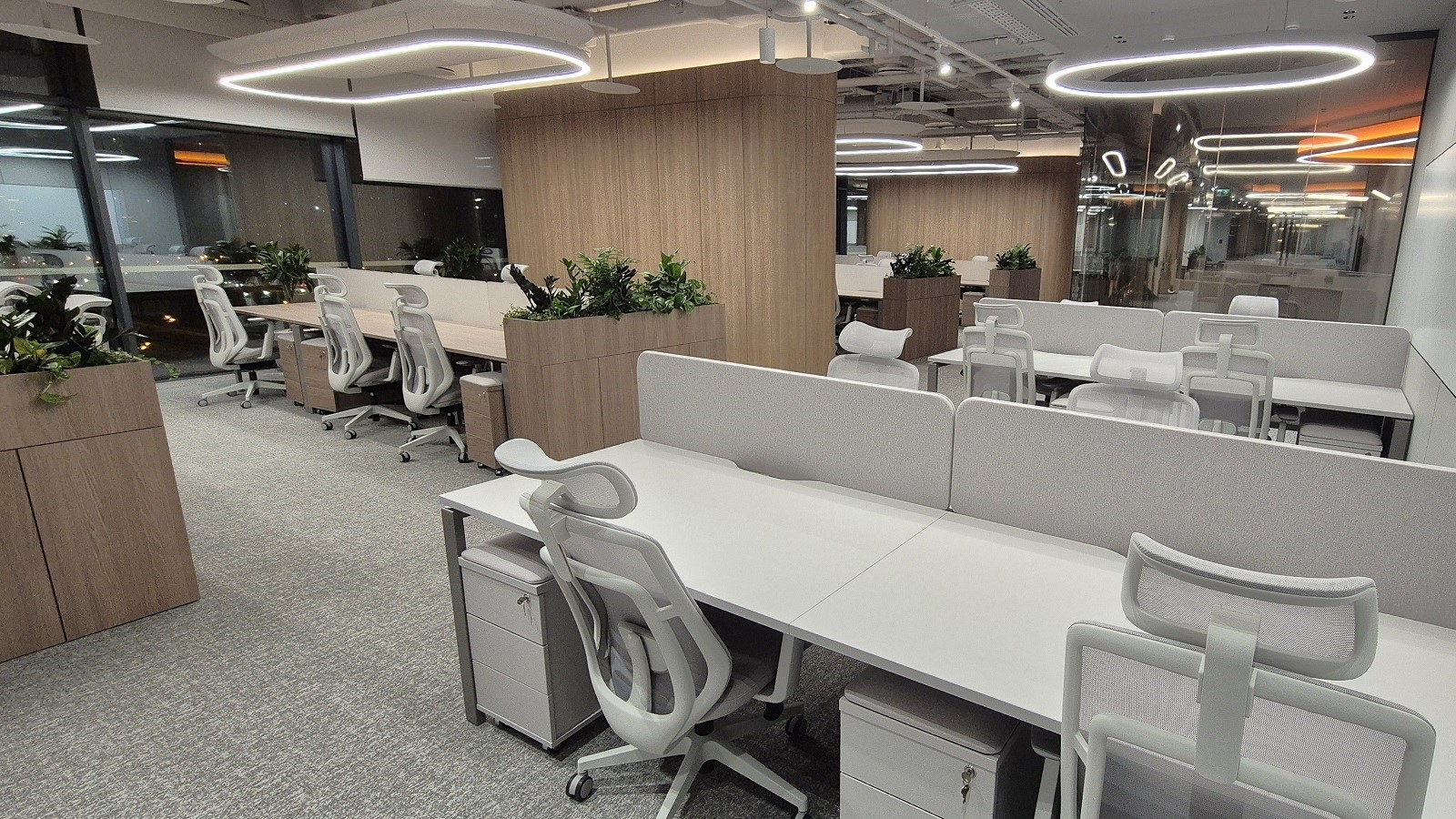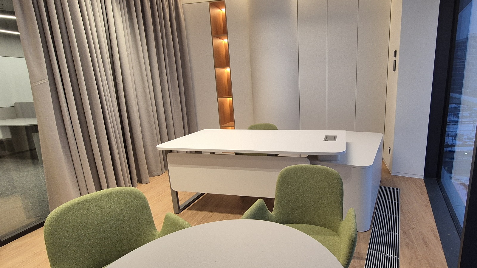 The workplaces of the employees and the offices of the managers are completed with furniture. All work desks are equipped with cable channels. The dividing screens are made of innovative plexiglass or acoustic fabric-covered material. Mobile pedestals are equipped with pillows, and plant pots are installed on low cabinets near desks in each work cluster.