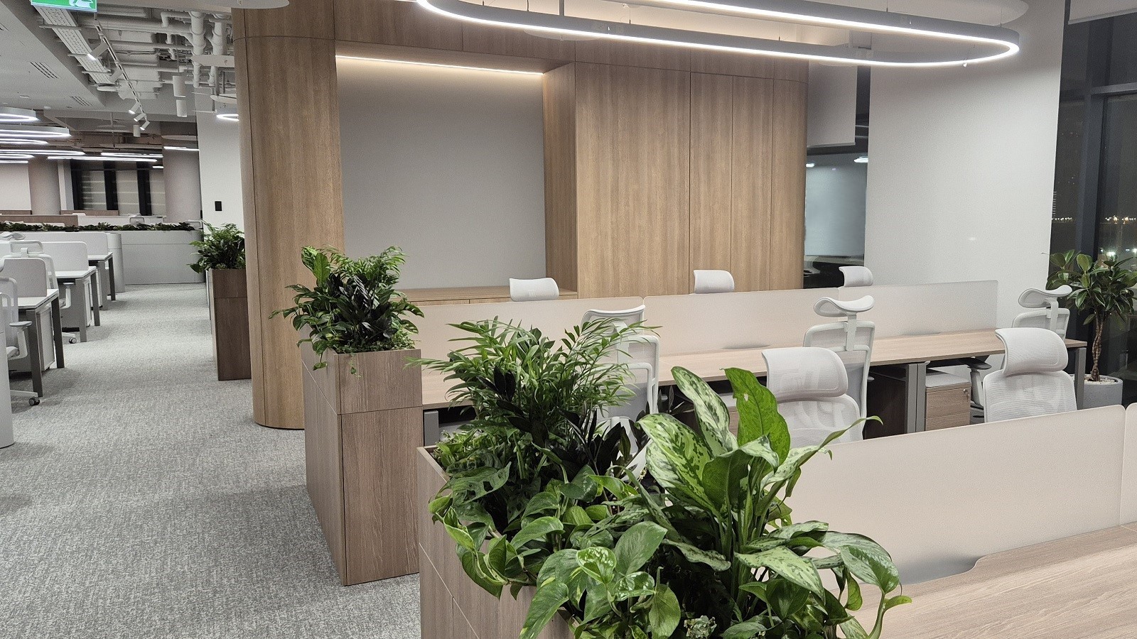 Neutral and natural colors have been chosen for furniture finishes, smooth lines and rounded shapes are used in furniture and interiors — combined with abundant greenery, this creates a comfortable energy-saving environment for the efficient work of the company’s staff.