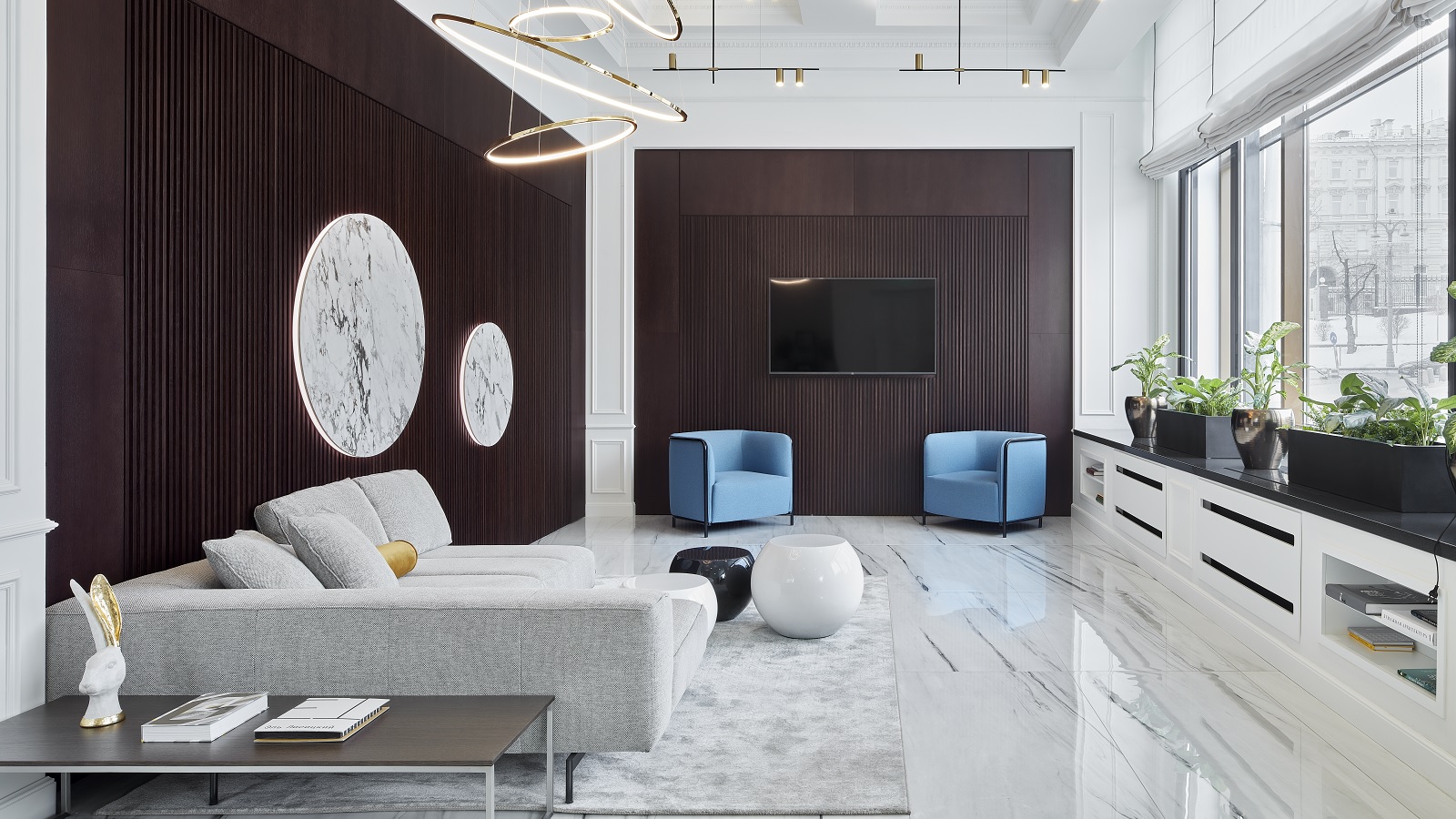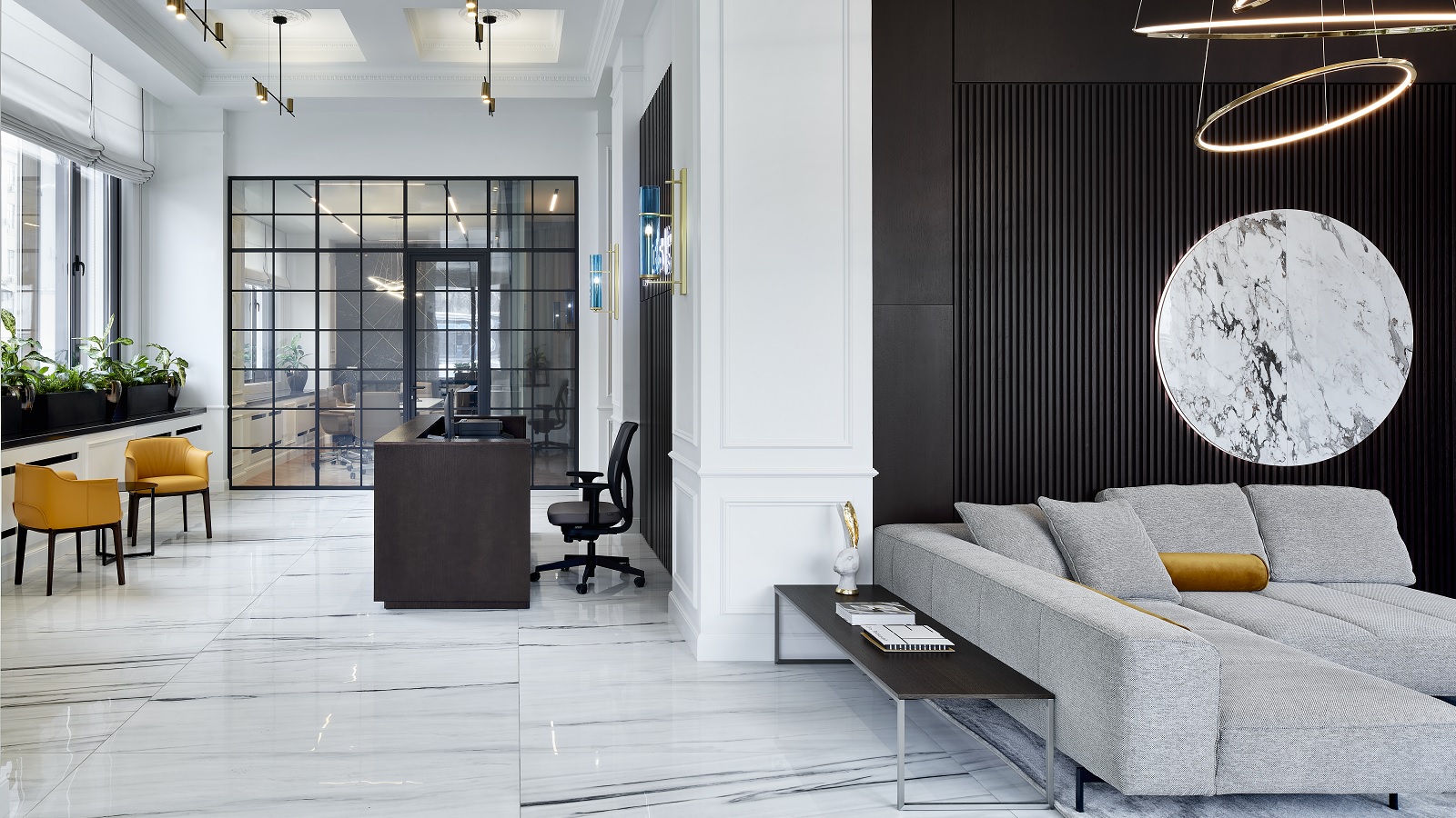The stylistic solution of the project is a modern French classic: non-standard technical solutions, premium materials and author’s decor are used for its implementation. The general marketing concept of PSB for VIP clients is cosmos which is reflected in the interior: the marble «moon» on the wall panels has become the «visit card» of the bank. The same non-standard marble pattern and rounded shapes are used in other pieces of furniture and decor.