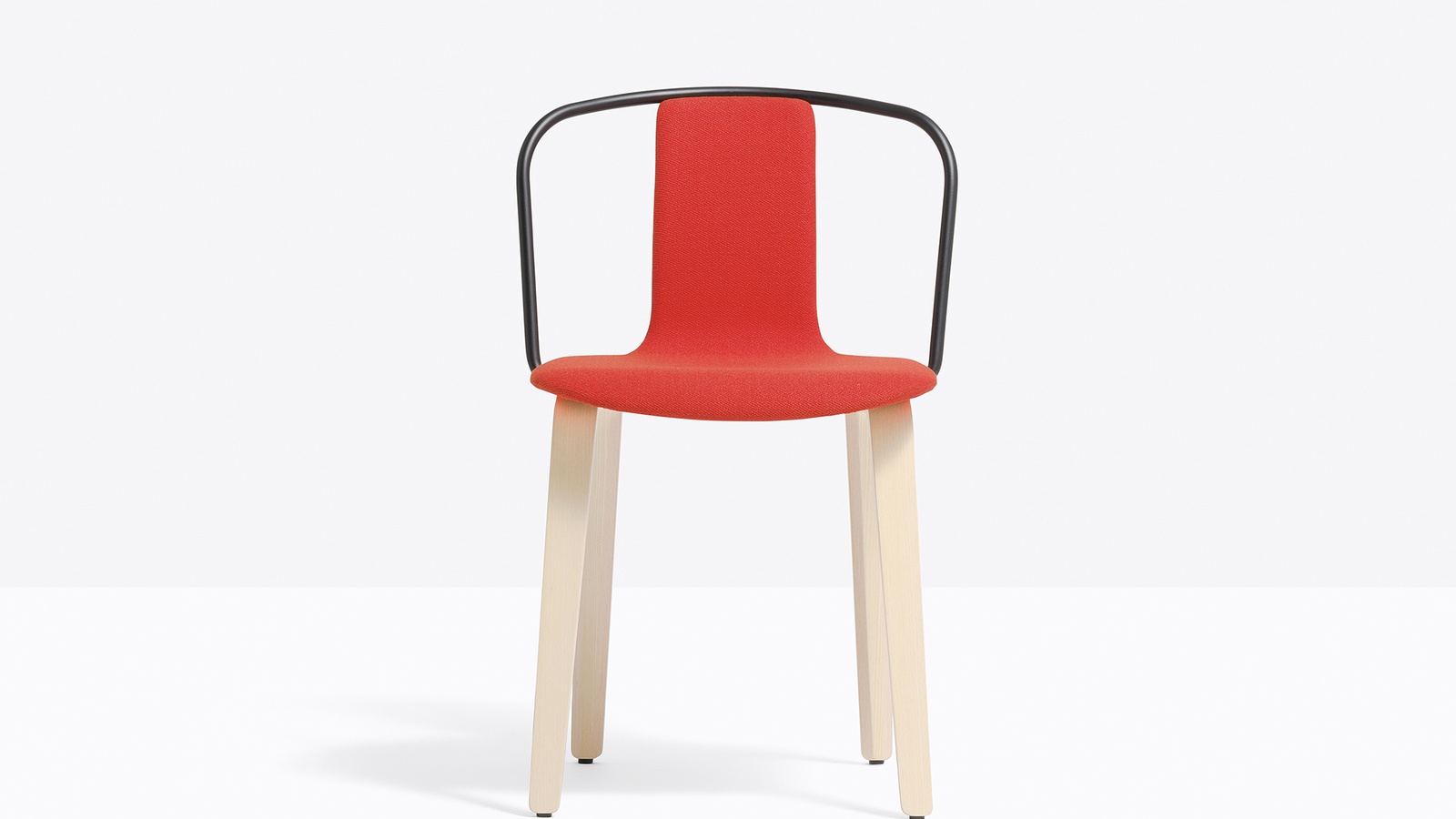 The shell of the upholstered in fabric or simil leather armchair is fully padded. The collection guarantees maximum customization thanks to the different finishes of the backrest combined with the shell and legs, which can be matching or contrasting with each other.