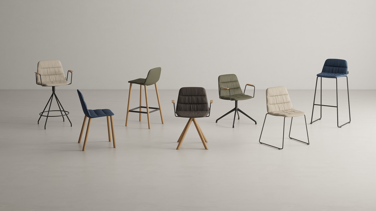 The Maarten collection offers a wide range of models: plastic or in different upholstery options; on various bases, including swivel and stackable; chairs with wooden, metal or upholstered armrests and an integrated writing tablet; lounge chairs and bar stools.