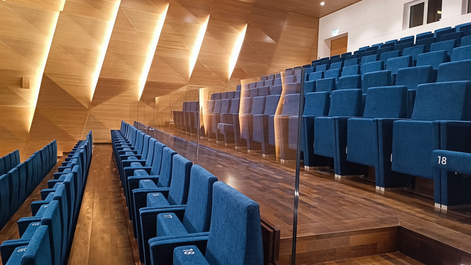 В креслах используется инновационный прочный наполнитель и премиальная износоустойчивая обивочная ткань. Все материалы также соответствуют акустическим требованиям театрального зала. Для зала Академии хореографии были изготовлены кресла с парой индивидуальных подлокотников (у каждого сидящего свое пространство для опоры локтей). Элегантный дизайн кресел органично вписывается в высокоэстетичную атмосферу учебного театра Академии.