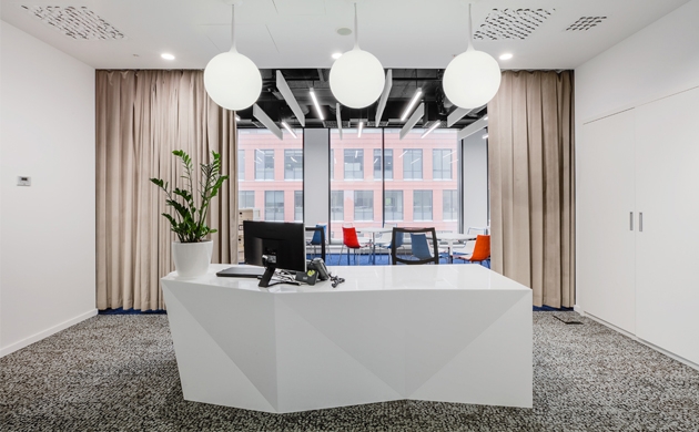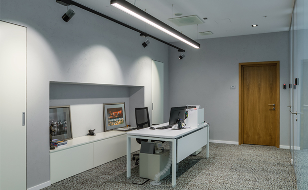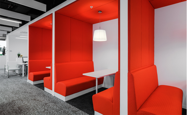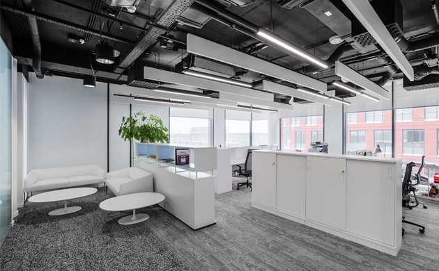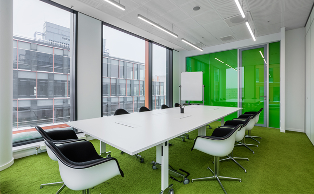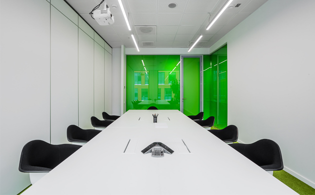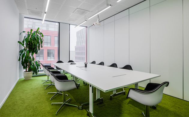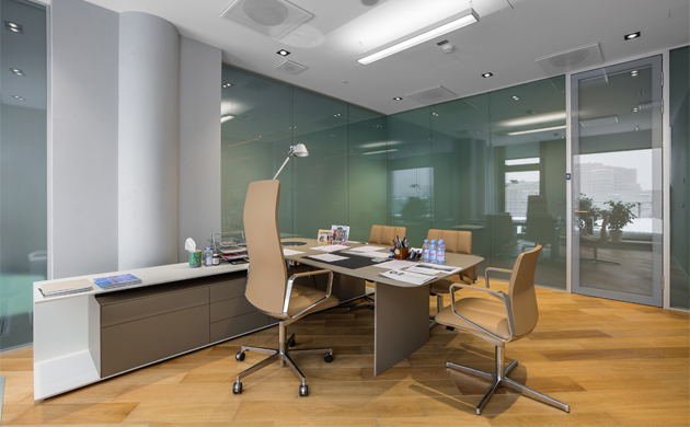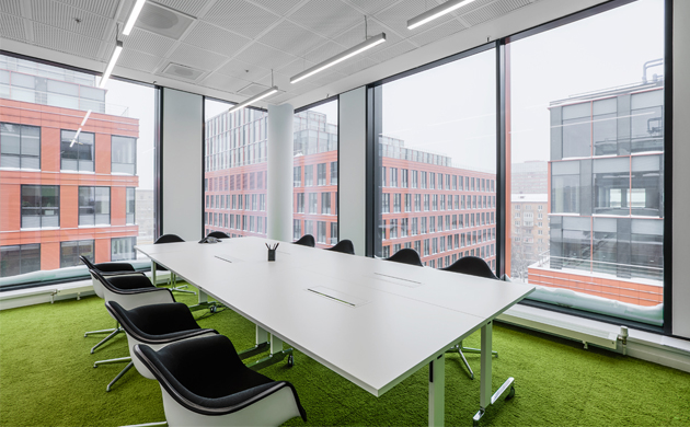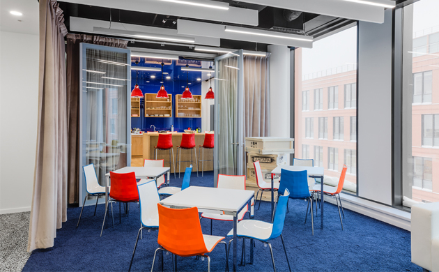 Архитекторы решили разделить рабочие пространства и зоны для неформального общения и отдыха, используя разные цветовые гаммы. Например, кабинеты президентов и переговорные оформлены в нейтральных серых и бежевых тонах с акцентами освежающего зеленого, а ВИП кухня и кофе-пойнт — в ярких красных и синих цветах.