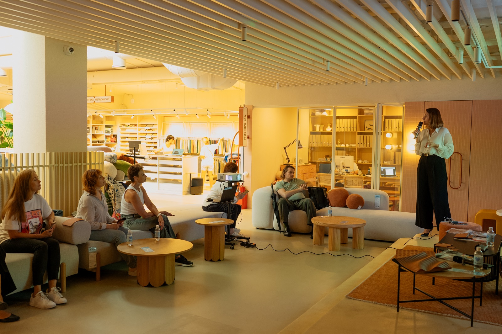 Спикеры мероприятия Артём Павлов и Татьяна Малофеева провели экспертную презентацию инновационной био-кожи, созданной на основе переработки яблок. Рассказали о технологии производства материала AppleSkin, преимуществах интерьерных решений с использованием этого экологически чистого продукта и важности продвижения экологичных и этичных материалов в дизайне.
