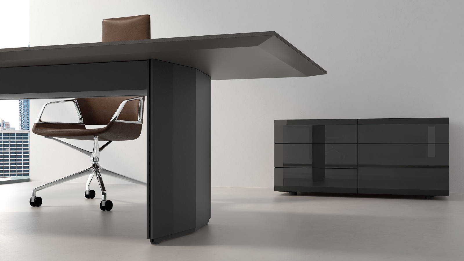 Провода скрыты за элегантно отделанными боковыми панелями. Креденция и шкаф из линейки Pace, выполненные в том же стиле, что и стол, станут идеальным дополнением к модели.