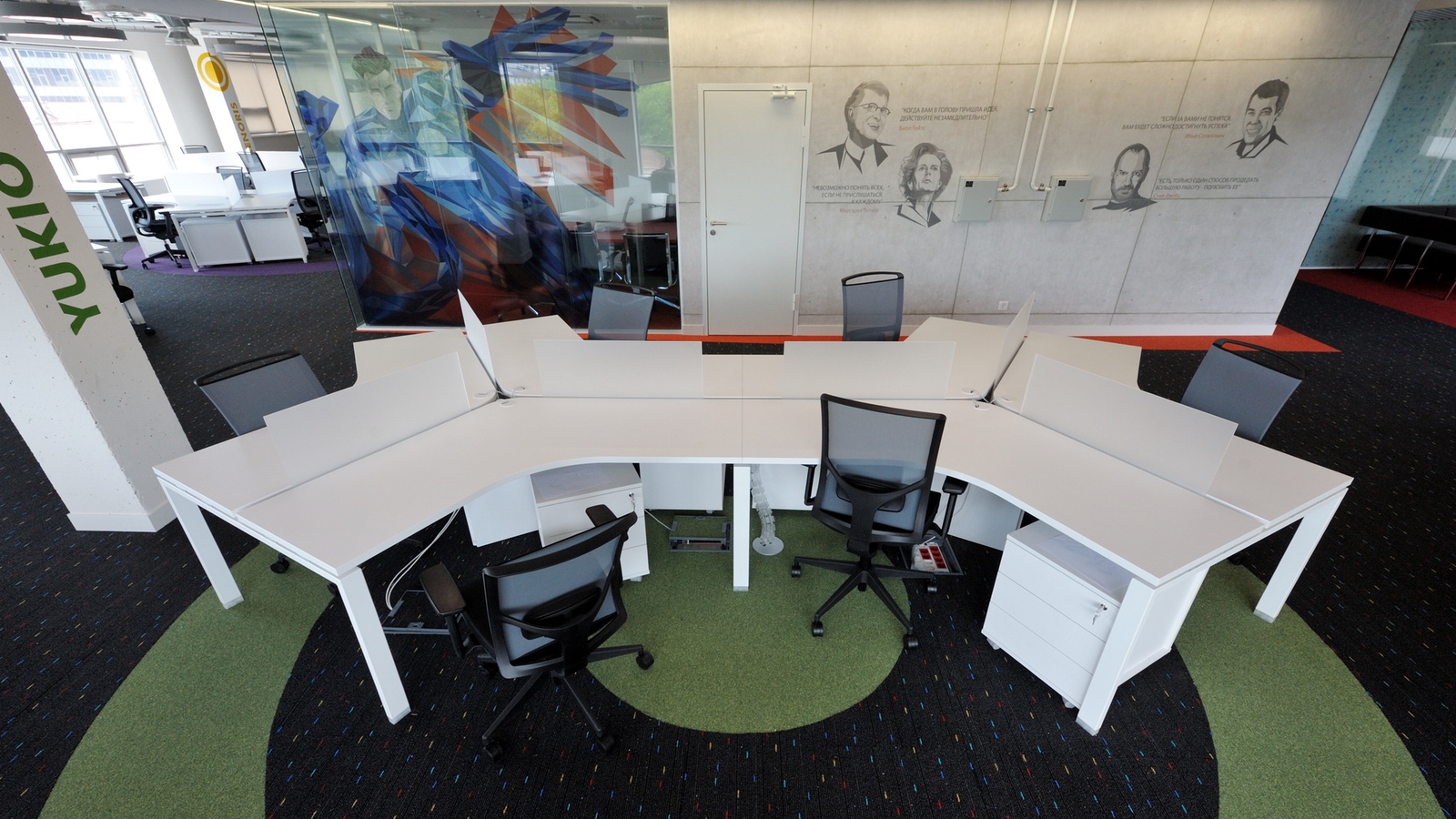 Meetings and discussions in the Laboratory are very frequent, so meeting rooms are equipped with screens in front of them that provide up-to-date information about their availability and allow to book the room for a certain time. Open space is visually divided into groups and departments using color elements and different configurations of clusters of workspaces. Even the walls of the Laboratory are specifically designed so that one can draw schemes or write down their freshest ideas on them.