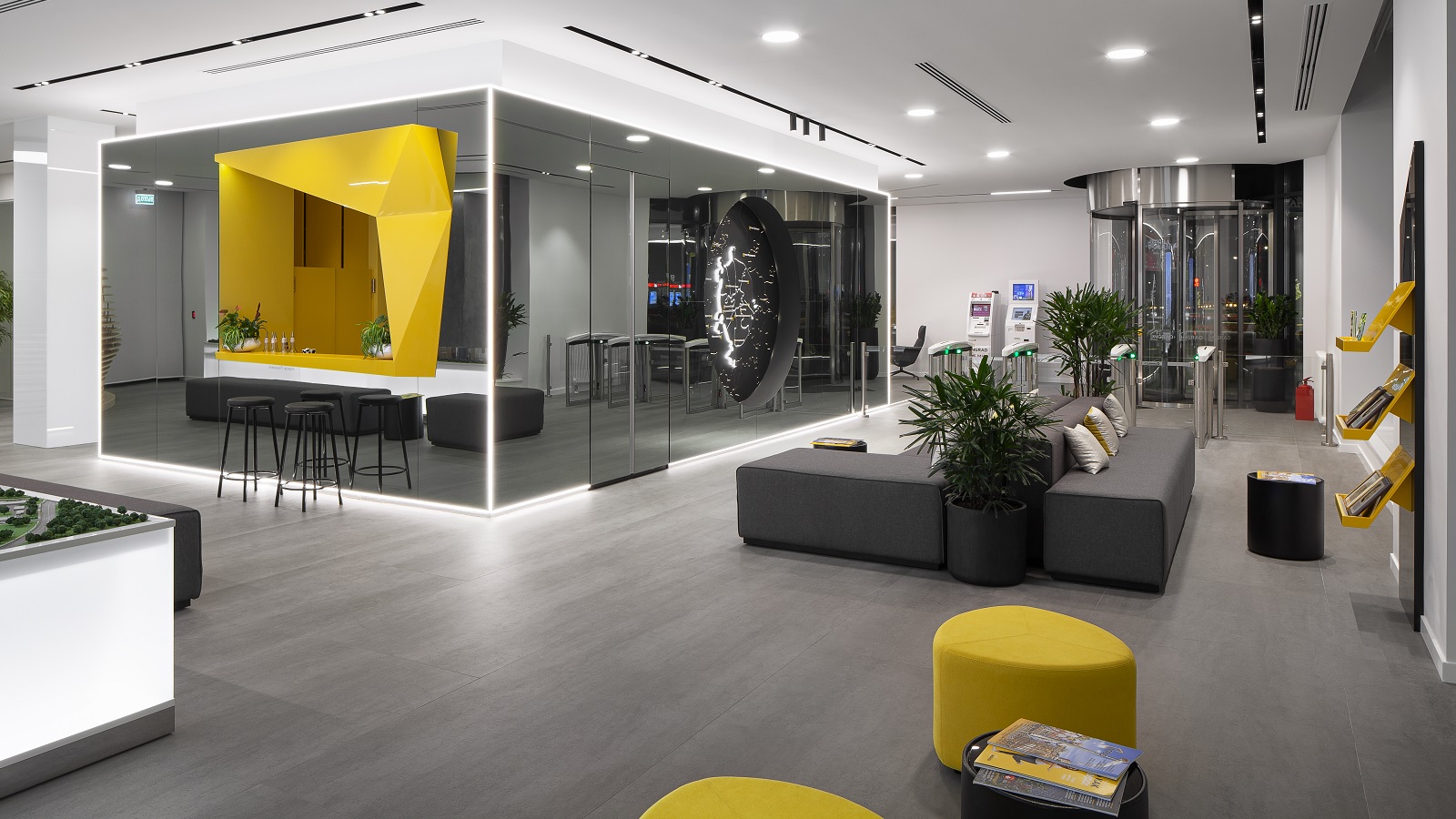 The giant «windows» of the reception desk and coffee-point, made of yellow artificial stone, are the spectacular central decorative elements of the client area. To decorate the fronts of high cabinets, painted MDF panels were used and ideally matched the color of the «windows». The comfortable waiting area has sofas and soft poufs of various shapes and dimensions. Comfortable meeting rooms are equipped with designed ergonomic furniture made in Europe. In addition to a large number of built-in furniture and sophisticated custom-made interior elements, furniture of European brands Andreu World, Pedrali, Narbutas, Cascando, is installed on the 1st floor.