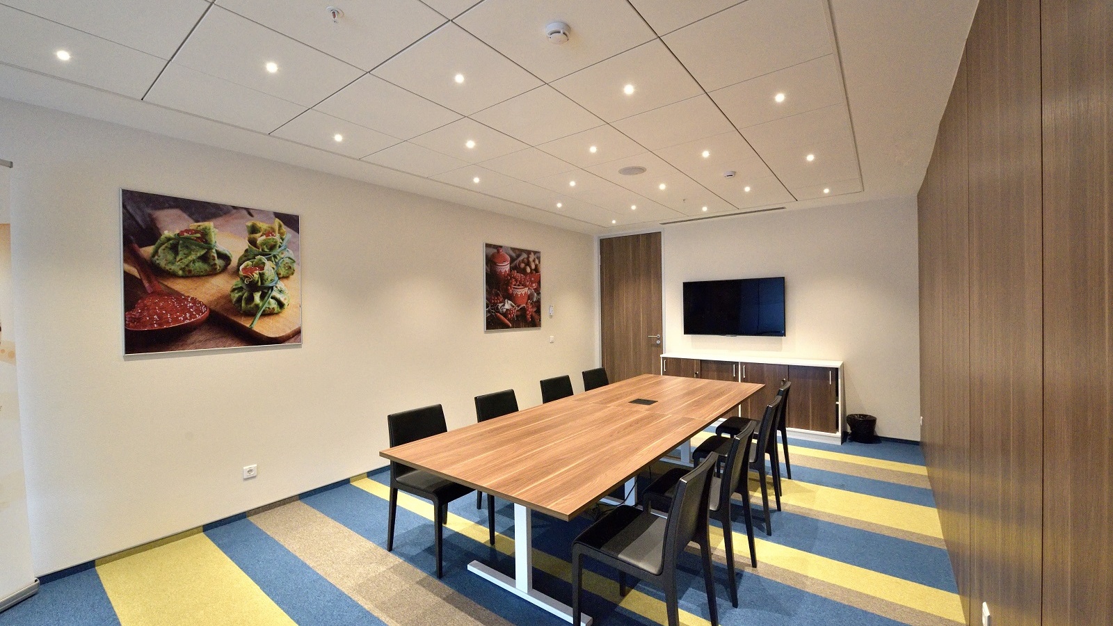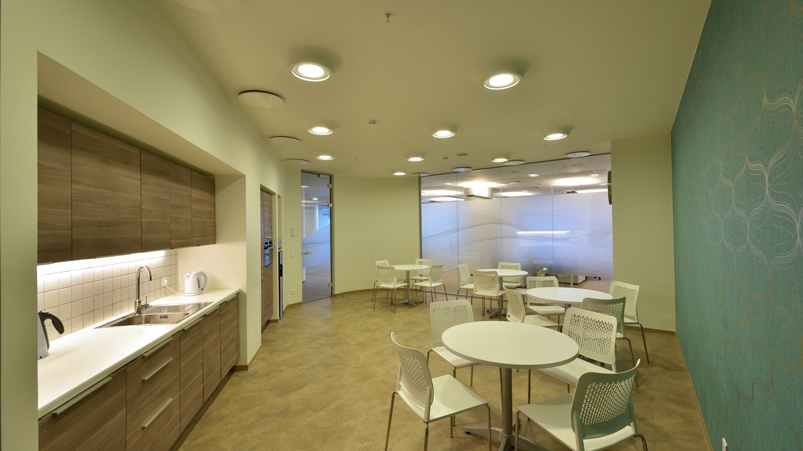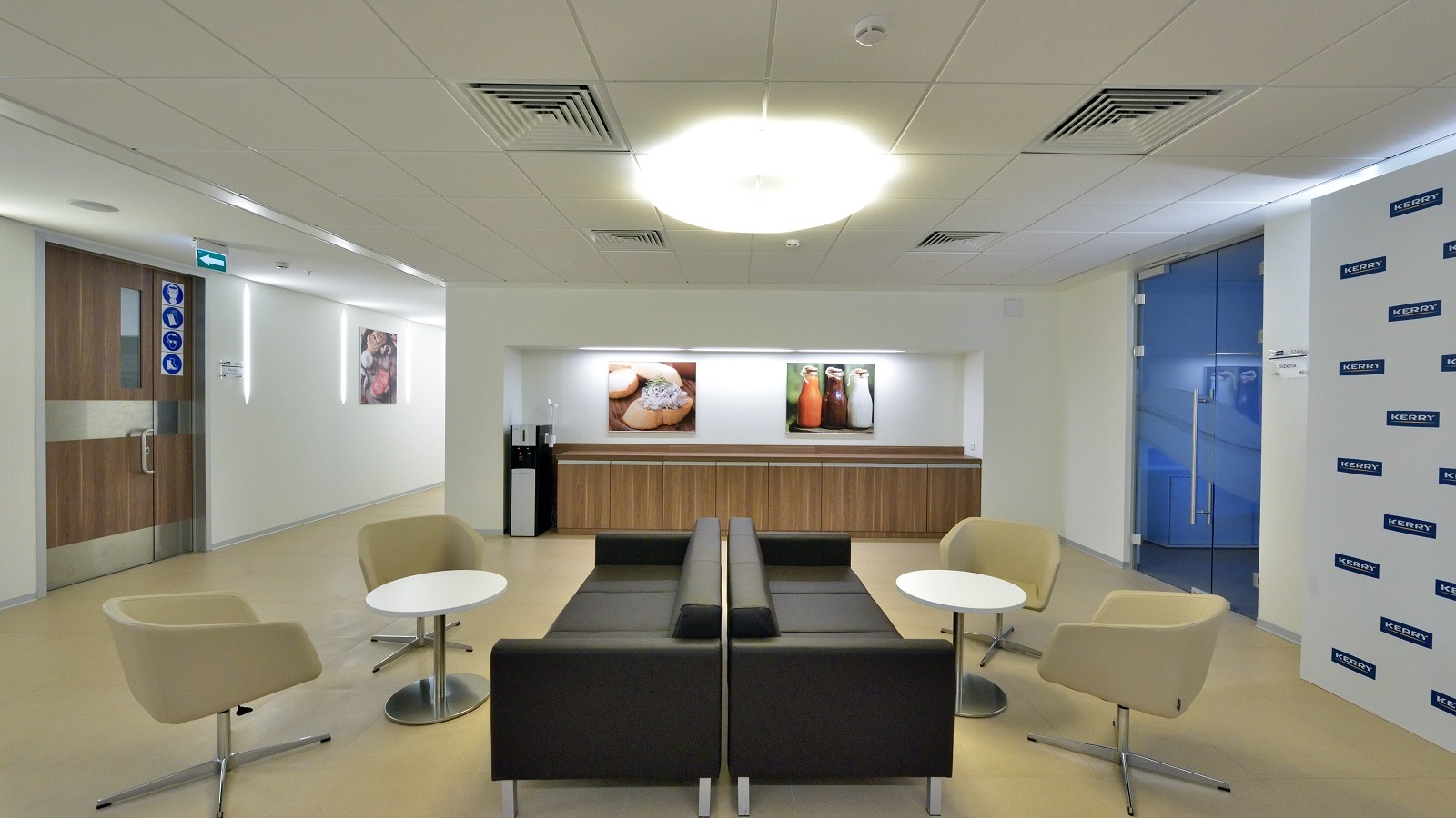 Kerry was founded in Ireland. In order to reflect the national roots of the brand in the design, it was decided to decorate the conference room with a large panel depicting the famous Mohair Rocks — one of Ireland’s most spectacular sights. The photographs of food, emphasizing the scope of the company, are placed on the walls of the kitchen, meeting rooms, and other areas. For the project, it was decided to select various models from the Lithuanian factory Narbutas as well as furniture from local manufacturers.