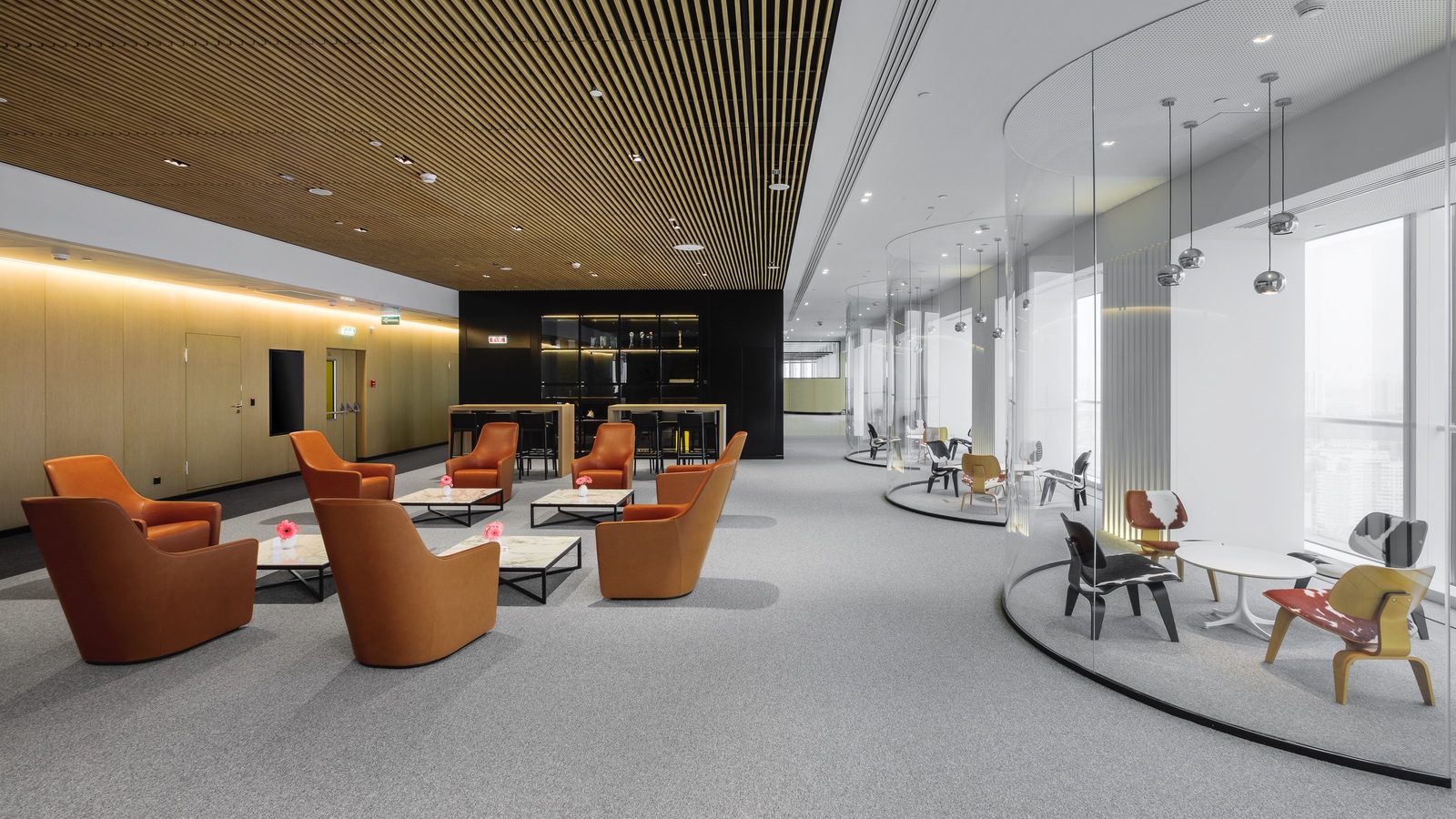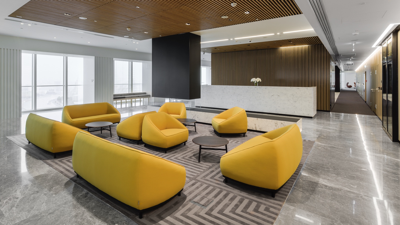 The new office has a total area of over 9000 square meters includes workspaces, private office rooms, kitchens, cafes, waiting zones, entrance halls and VIP rooms. When designing the interior, it was decided to use soft neutral shades of gray with bright color accent pieces.