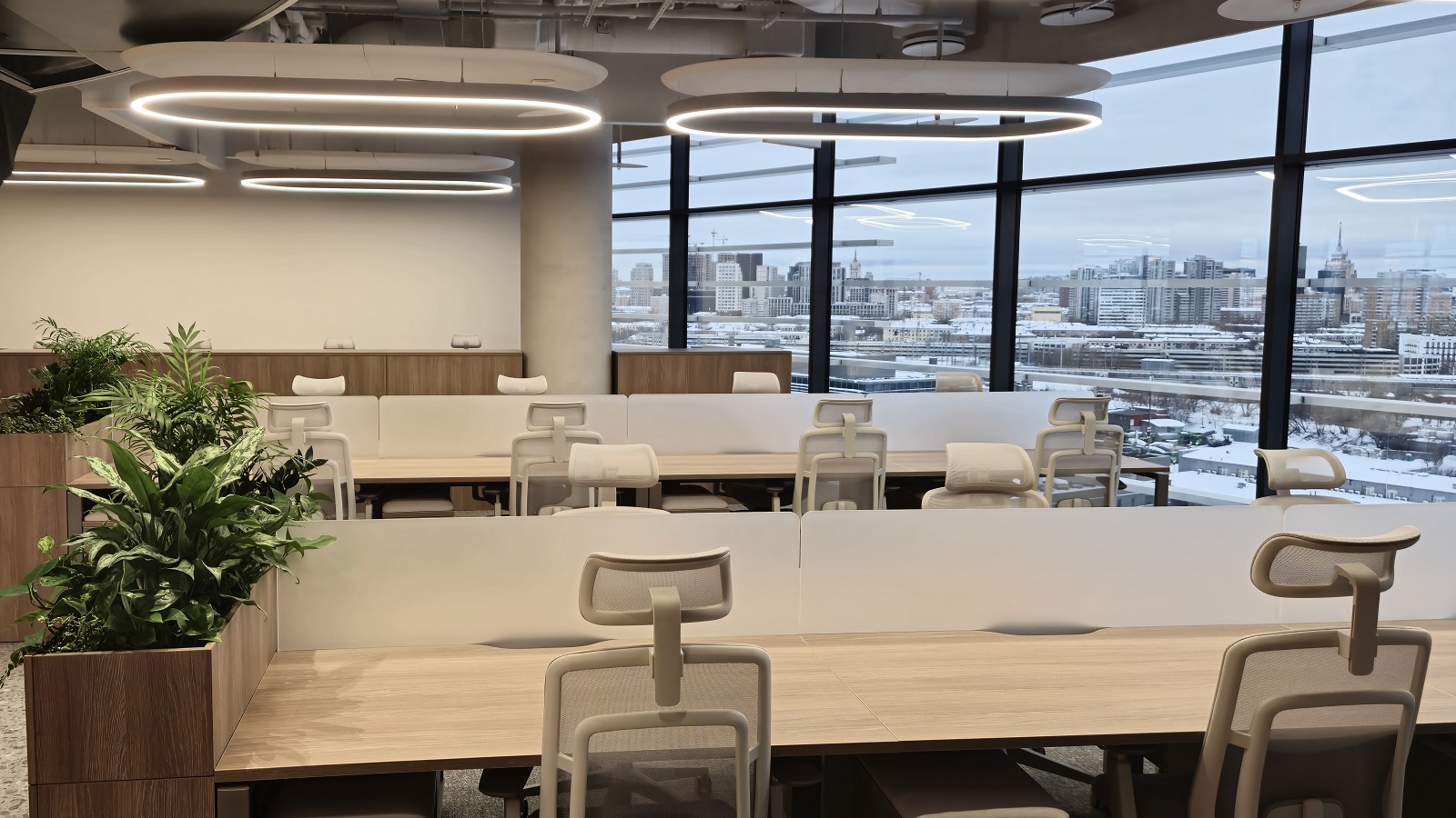 Neutral and natural colors have been chosen for furniture finishes, smooth lines and rounded shapes are used in furniture and interiors — combined with abundant greenery, this creates a comfortable energy-saving environment for the efficient work of the company’s staff.