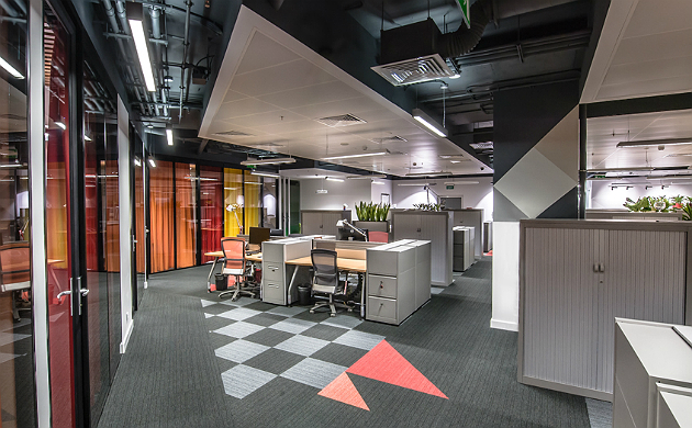 Новый офис похож на увлекательную экспозицию гигантских оригами разных цветов, фактур и конструкций. Характерный рисунок из пересекающихся плоскостей и линий повторяется в отделке стен и полов, задавая активный ритм и наполняя энергией рабочее пространство.