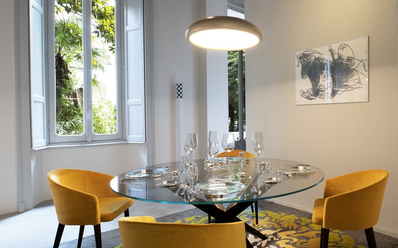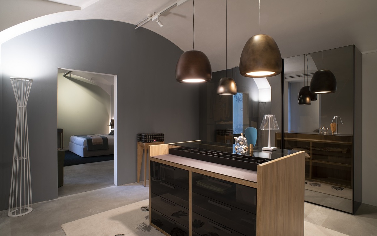 The MIG showroom is a space designed to live an experience, to welcome suggestions and find inspiration. A path to be experienced individually immersed in the design and culture of doing typical of four historic Italian furniture and lighting companies. An exclusive space located in an equally prestigious location. The palace, a stately building from the 1700s, was the subject of one of the most successful examples of interior architecture experimentation carried out by the architect Tadao Ando, one of the main Japanese architects and among the greatest representatives of contemporary architecture.