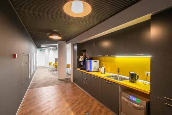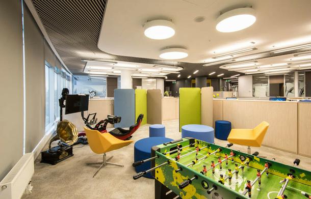 Одним из ключевых пунктов планировки офиса стали просторные зоны отдыха для неформального общения сотрудников, оформленные в ярком стиле и включающие в себя кофе-пойнты, кафетерий и игровую зону.