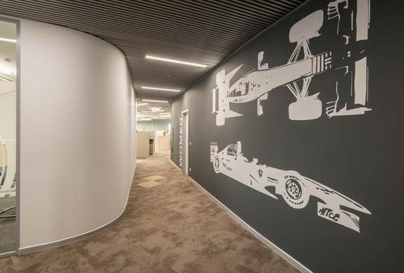 Одной из основных задач в оформления офиса стала цель еще больше сплотить рабочий коллектив и сделать командную работу еще эффективнее. Интерьер, оформленный в стиле автогонок Формулы-1, являющий собой наглядный пример слаженной командной работы, идеально подошел для этой цели.