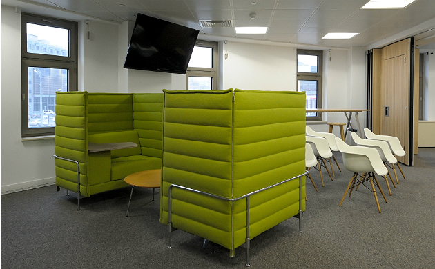 Пространство офиса включает также переговорные комнаты, уютные диваны Alcove от Vitra с высокими спинками, зоны для неформального общения и конференц-зал. Зонирование осуществляется с помощью мобильных перегородок.