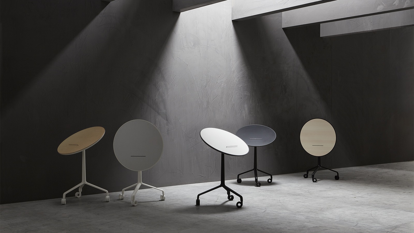 The UseMe mobile tables created by the Italian manufacturer Sitland have a round tabletop with a diameter of 60 cm, which is located on a base with 1 leg and 3 castors. The table top has 3 possible inclinations: 90 °, 30 °, 0 ° and a support system which ensures optimal visualization of the screen. The height of the table is 97.3 cm.