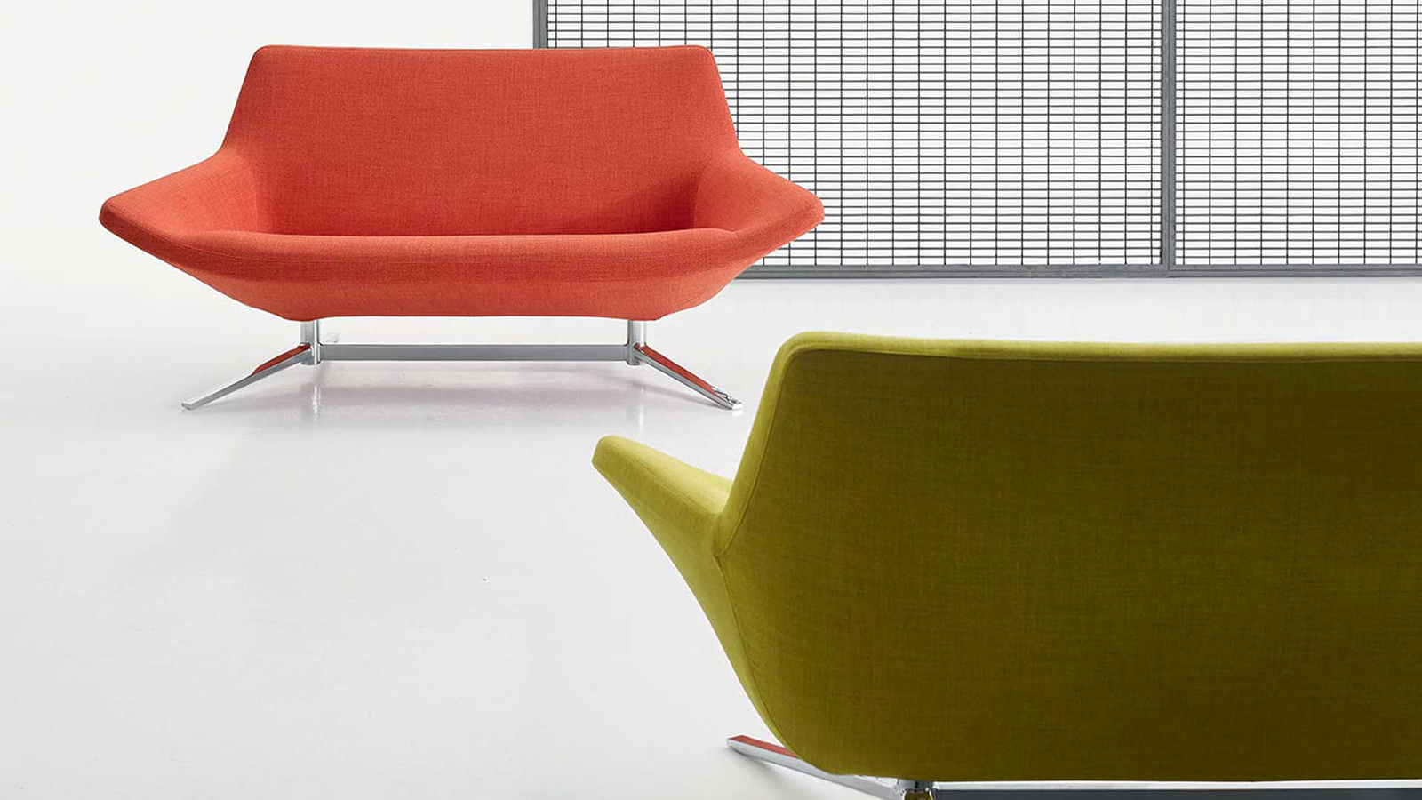 The seat that flows uninterruptedly into the armrests is the hallmark of this small armchair and relaxation chair. The former, with aluminium swivel base and four spokes, combines elegance and comfort. The latter, which is also swivel and has a matching ottoman, is larger with a headrest with magnet for adjustments. There are two bases available, one with four spokes and one circular, both in bright brushed aluminium.
