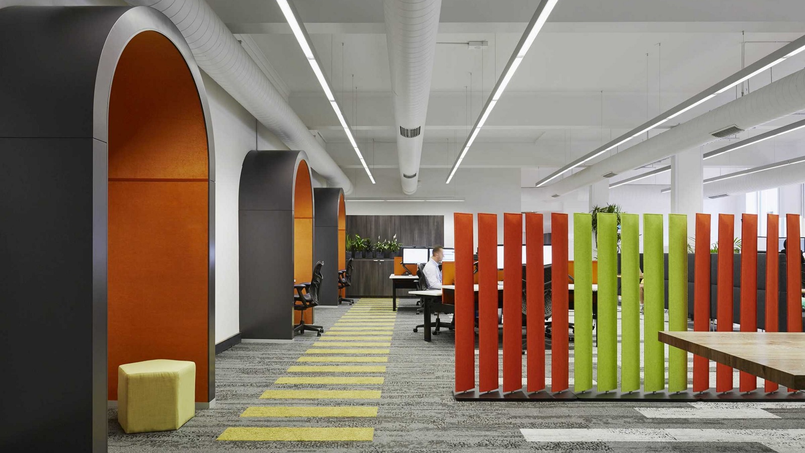 BuzziBlinds consist of 4 different shapes. The rotating acoustical blinds made of aluminium are covered with plain BuzziFelt.