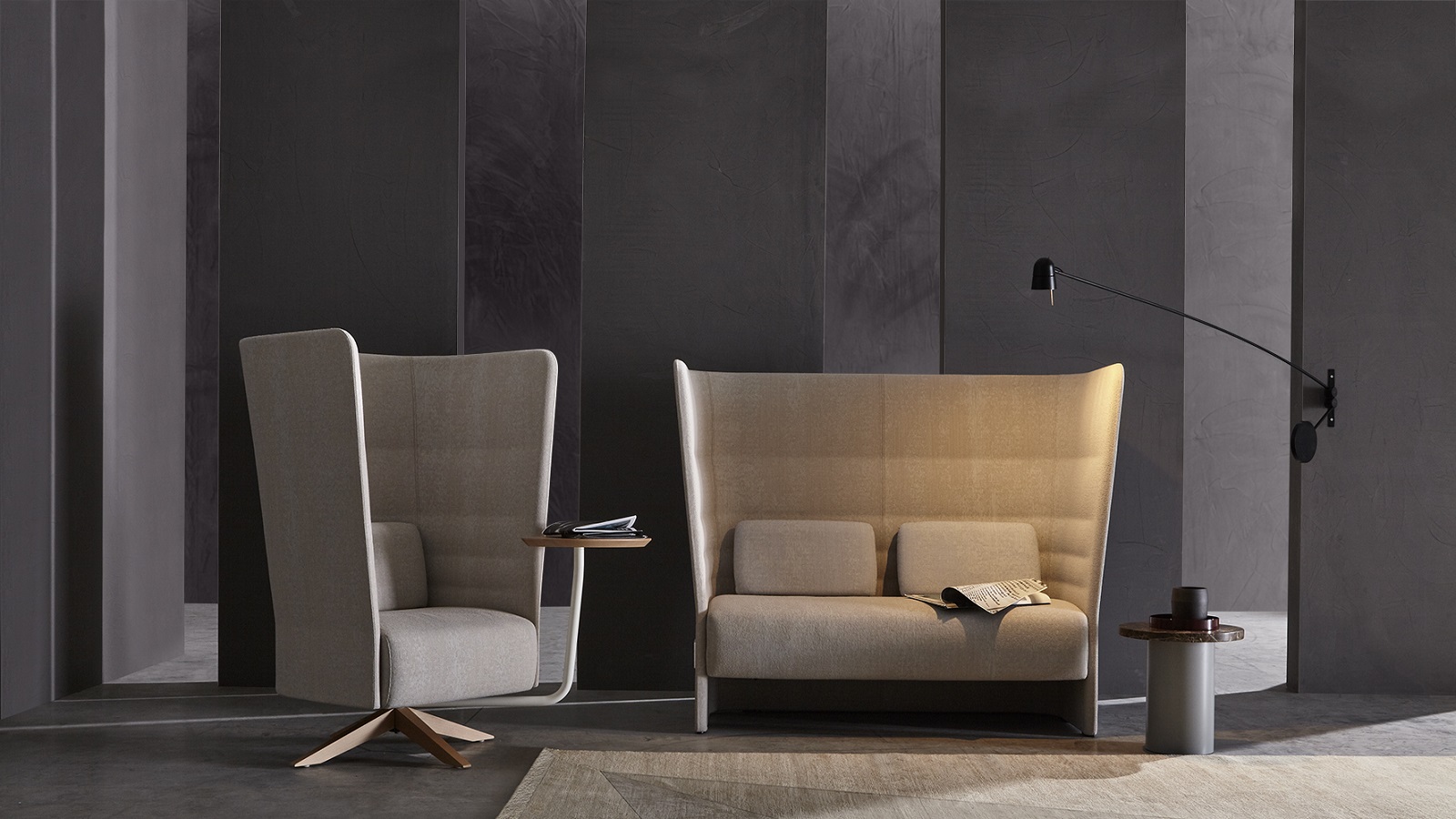 The Dorigo design seating system, featuring the original extra-height back, designed for discretion and relaxation. Cell128 offers private moments of solitude, precious for a pause or an unexpected work session. An elegant coffee table, with rotating top and support, adds to the comfort of the decor, with possible customisation with a pop-up USB charger.