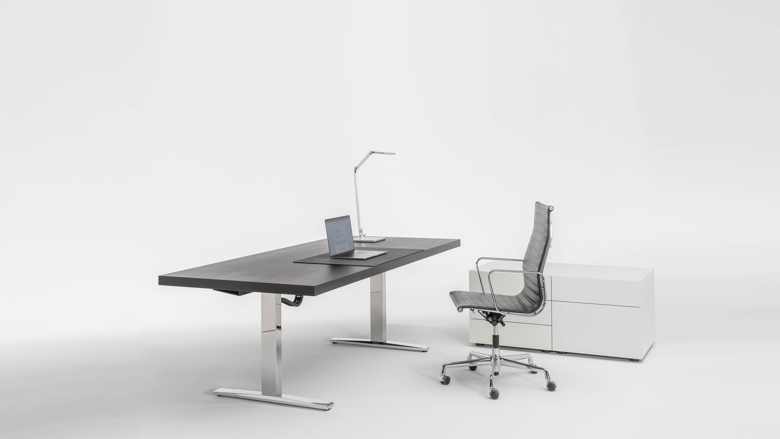 The executive desk Upsite by German brand Renz is perfect for managers who lead an active life since it allows working seated or standing. The elegant desk has a laconic straight shape, a lightweight design and is adjustable in height.