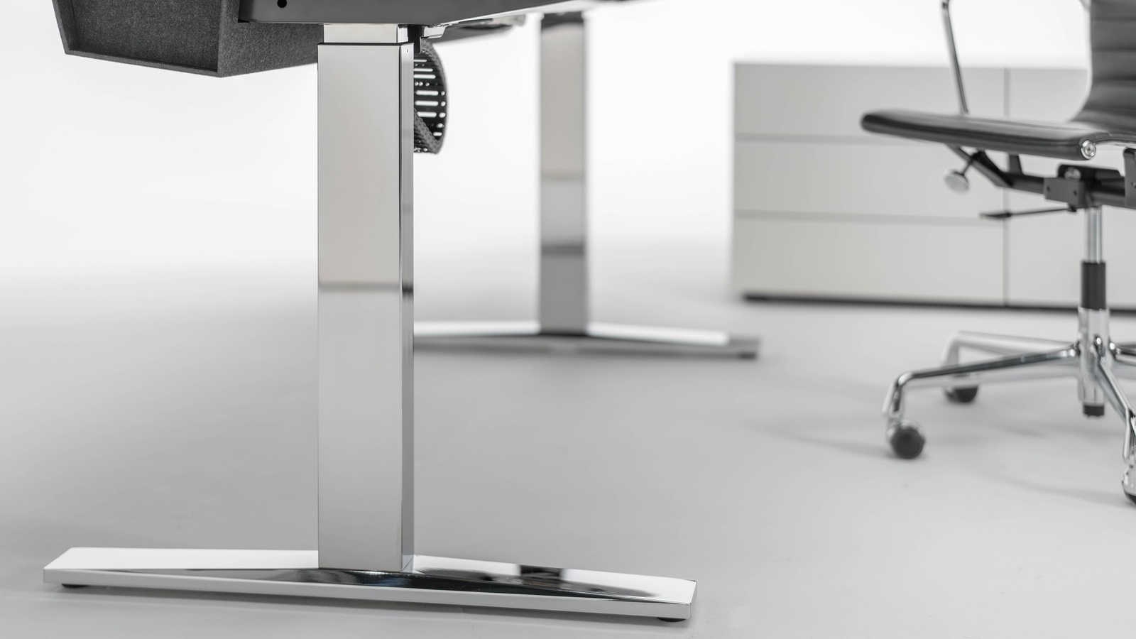 The model features a light and clear design and is height-adjustable. The Upsite desk has a hidden horizontal cable channel made of felt and sports an innovative locking technique. The model has a chrome-plated base and is easily mounted.