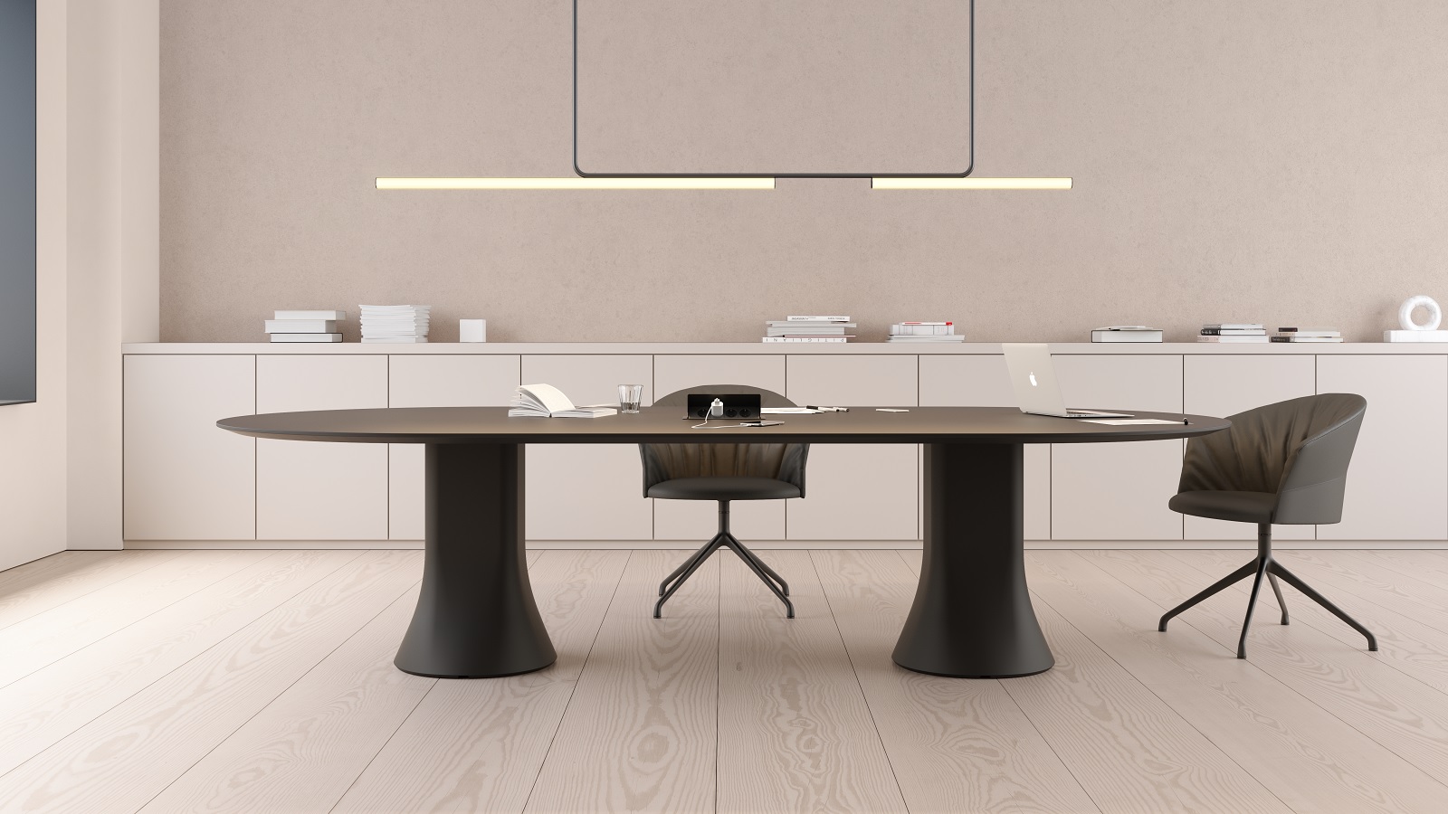 The Cambio collection has a wide range of table sizes — from 60cm in diameter up to 5 meters, with a well-thought-out electrification solution. Two height options (74 and 105 cm) and various finishes are available. Cambio offers solutions for a wide variety of spaces, including dining and meeting rooms.