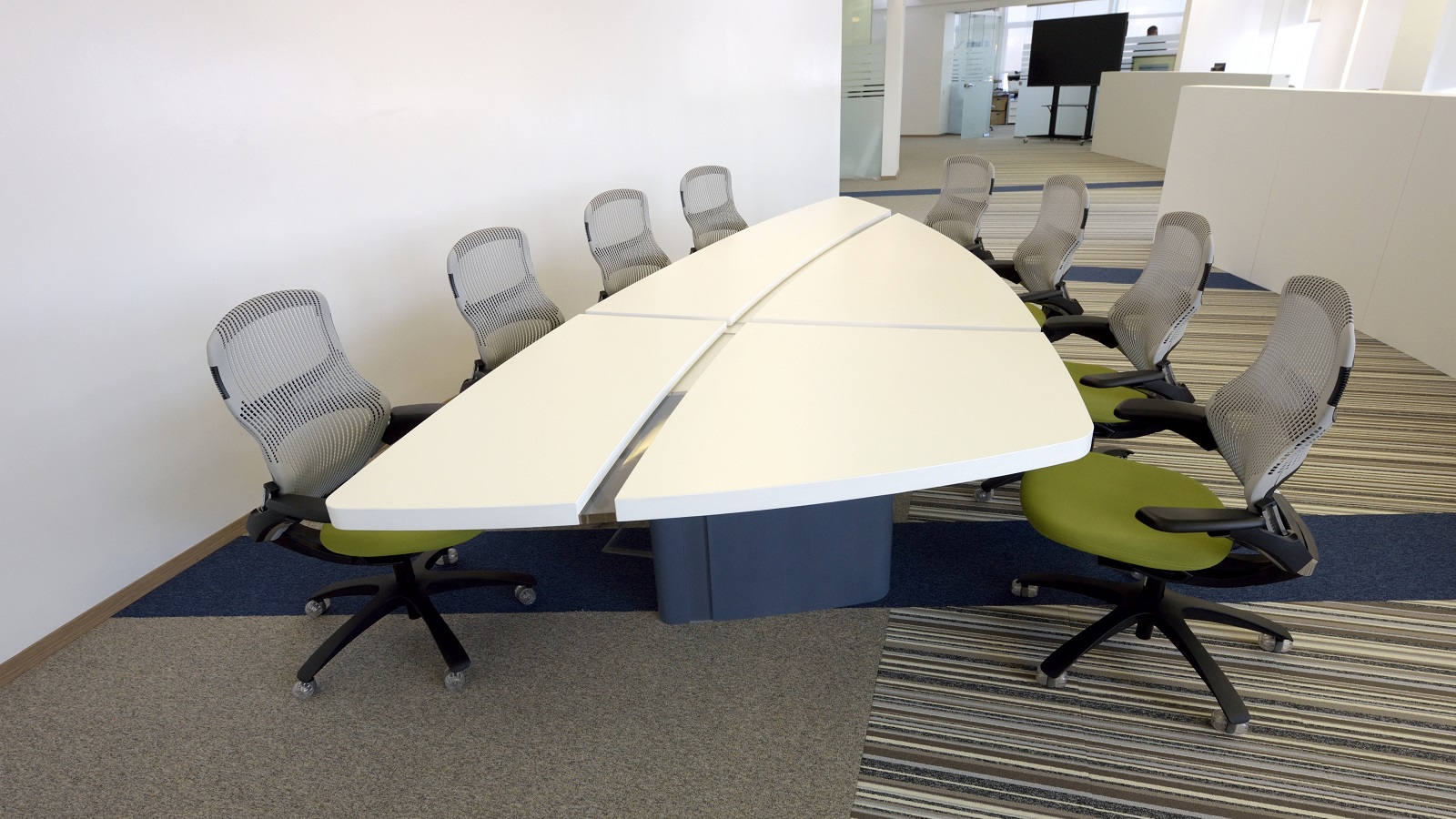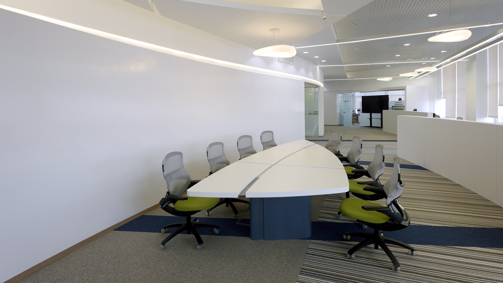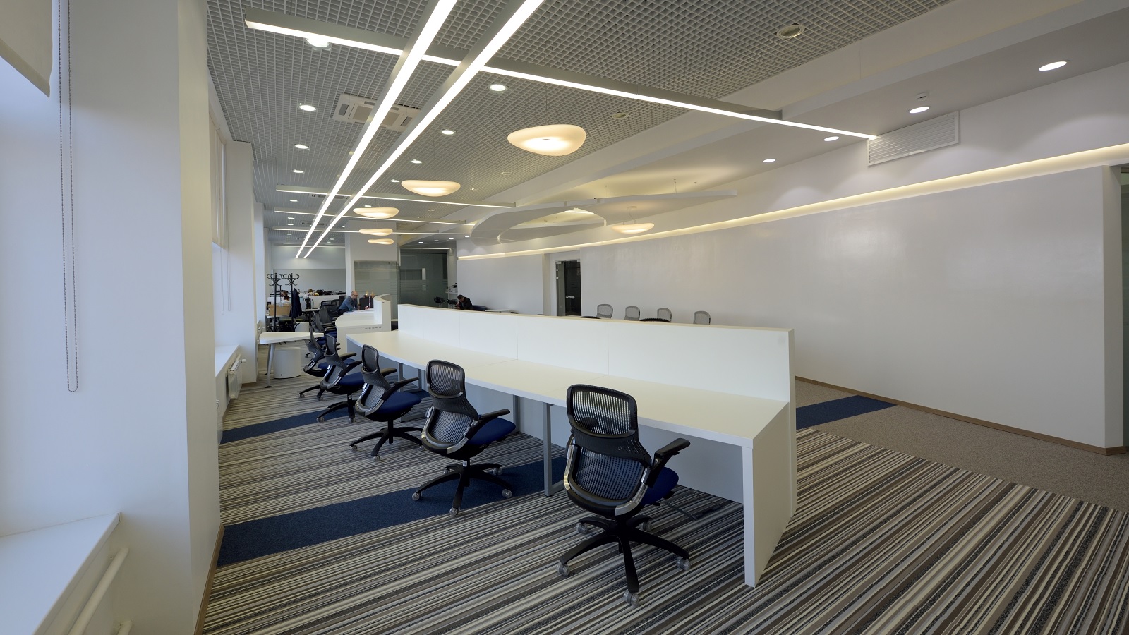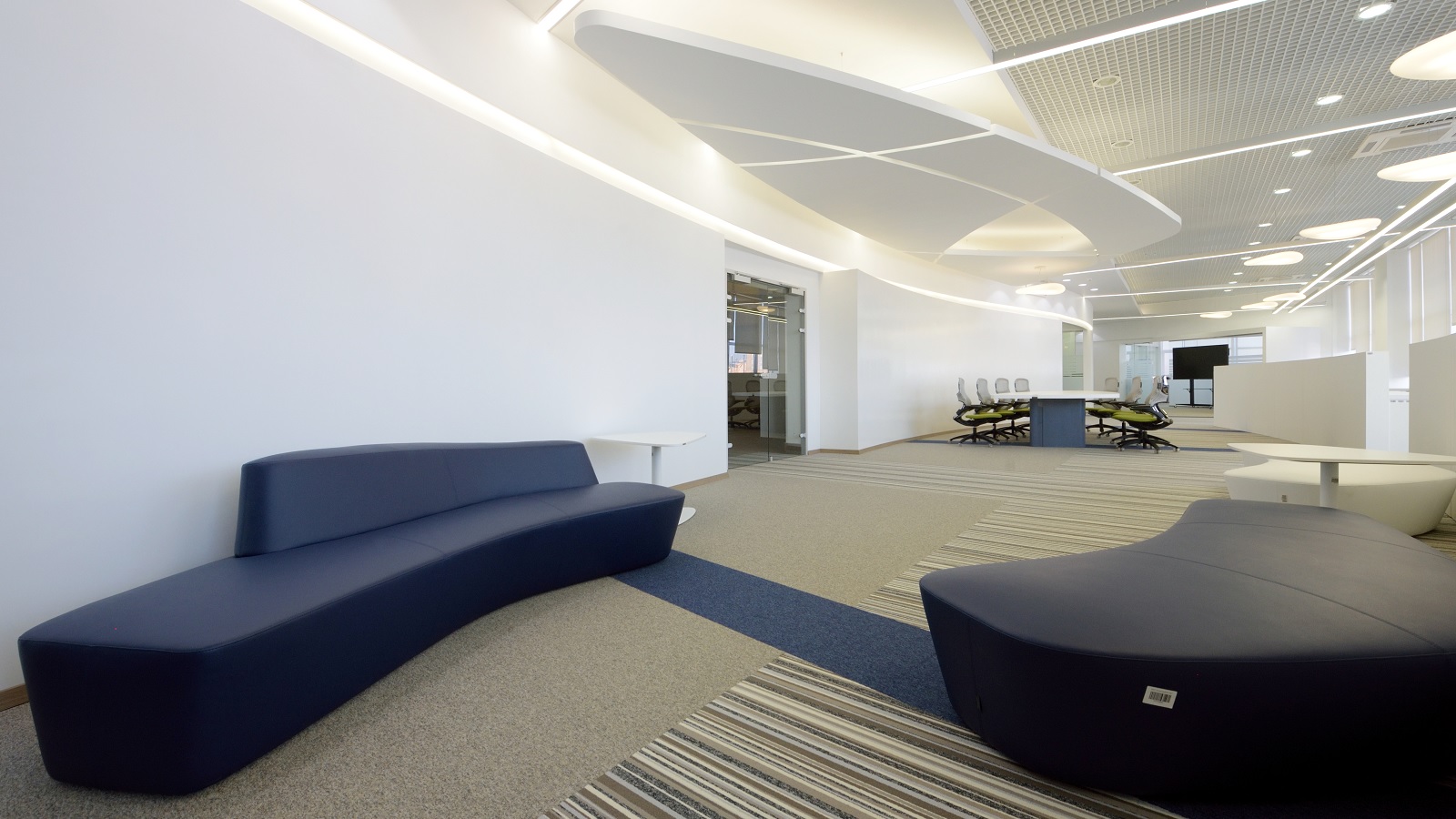 Предметы мебели гармонично вписались в общий интерьер рабочих зон, оформленный в классических цветах, добавив ярких акцентов. А диваны и рабочие столы необычных геометрических форм придали интерьеру дополнительную оригинальность. Общая площадь помещения офиса составляет 824 квадратных метров.