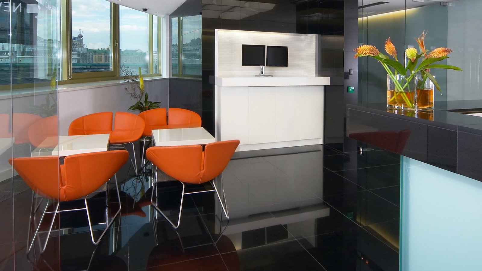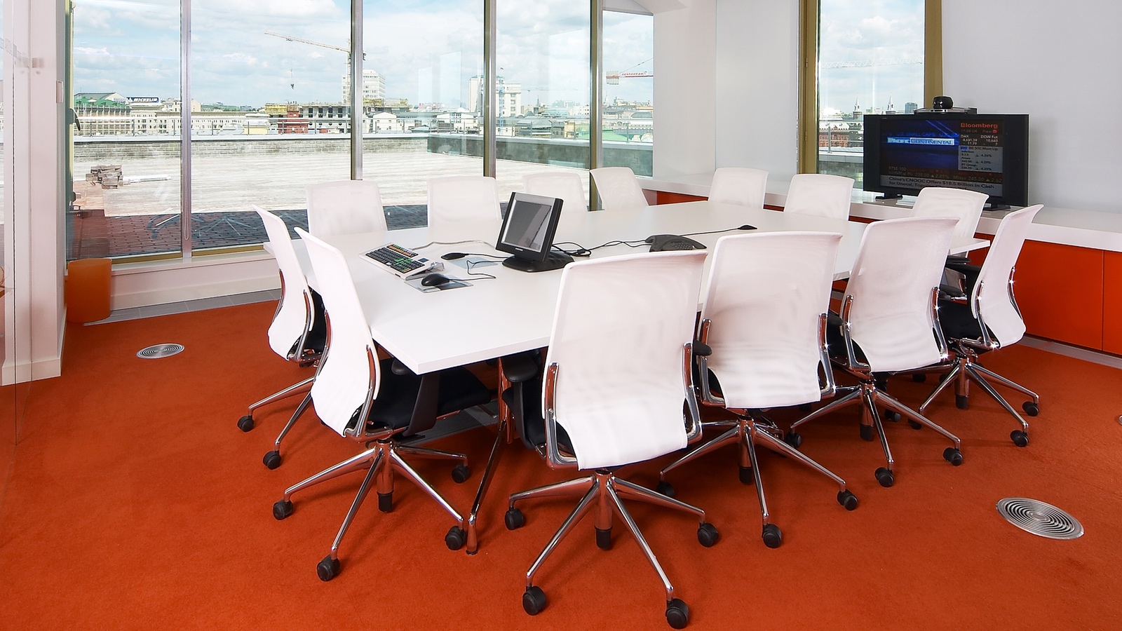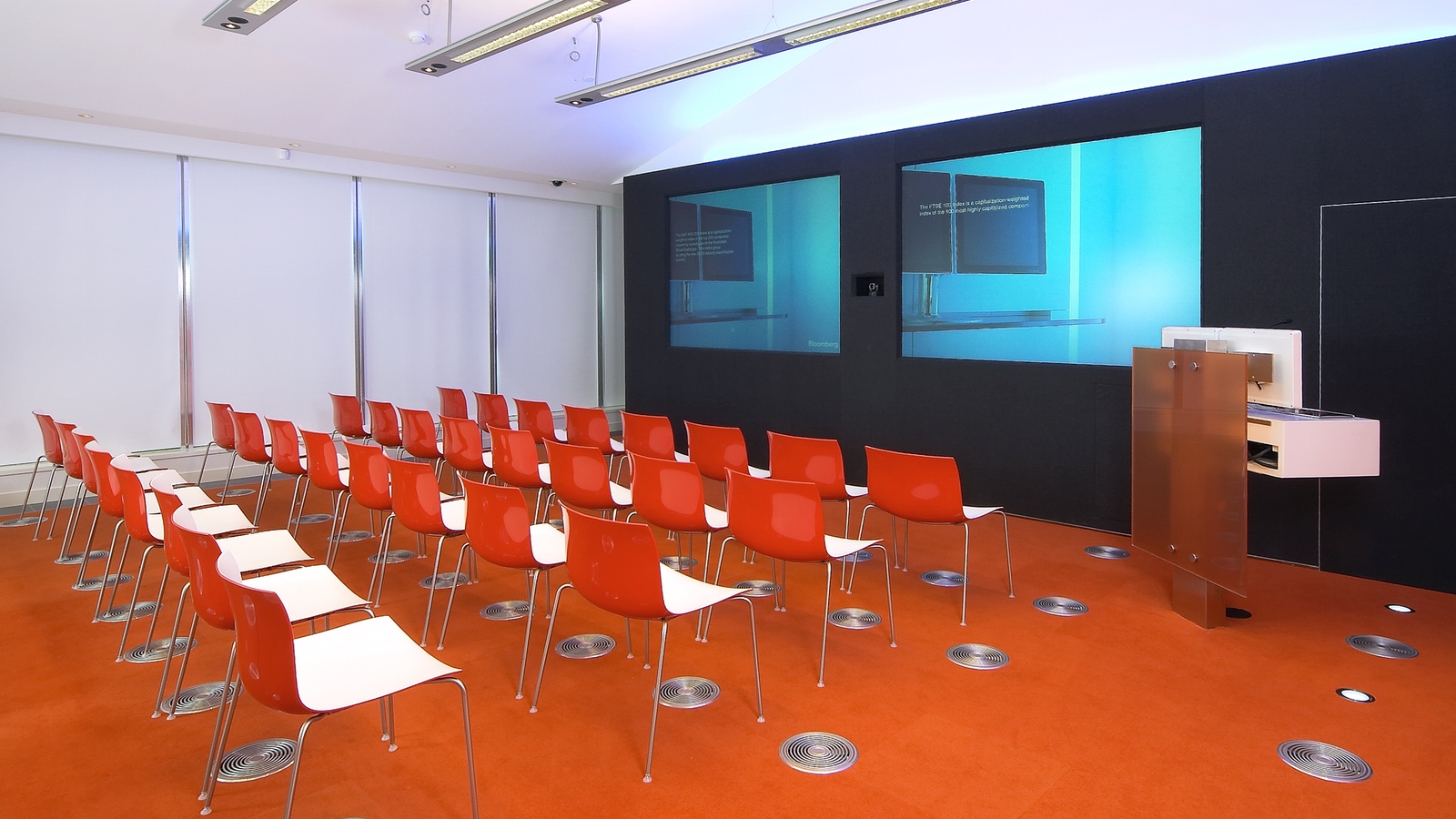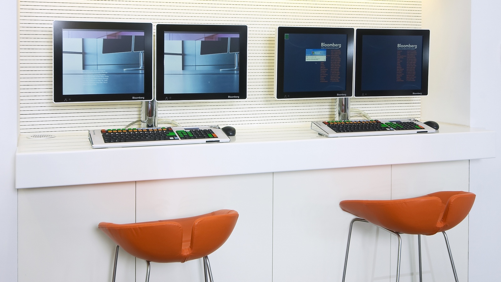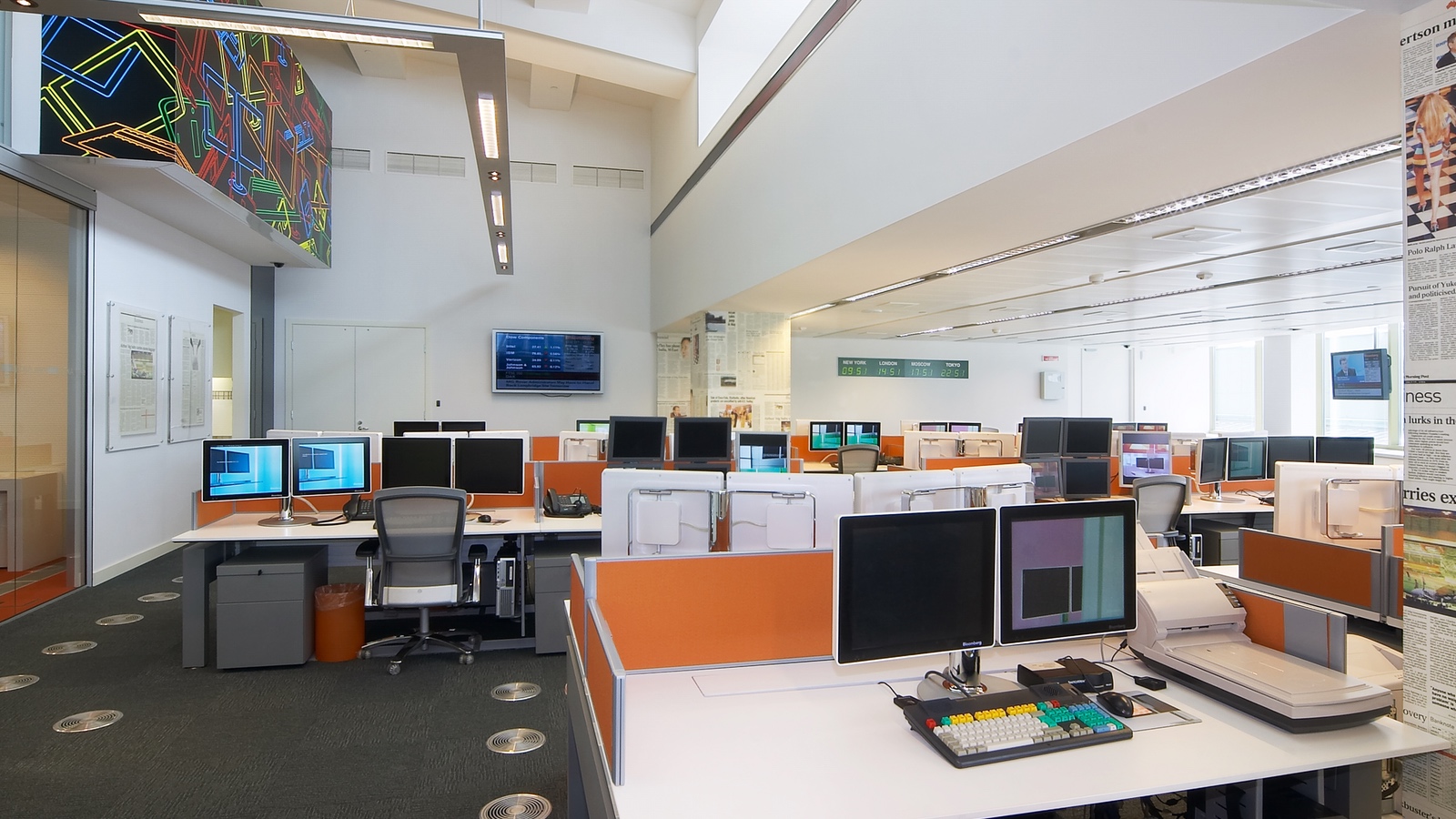При создании решения для офиса компании Bloomberg основной задачей Concept было удобно разместить на рабочих местах большое количество специального оборудования, сохранив при этом легкость и прозрачность интерьера.