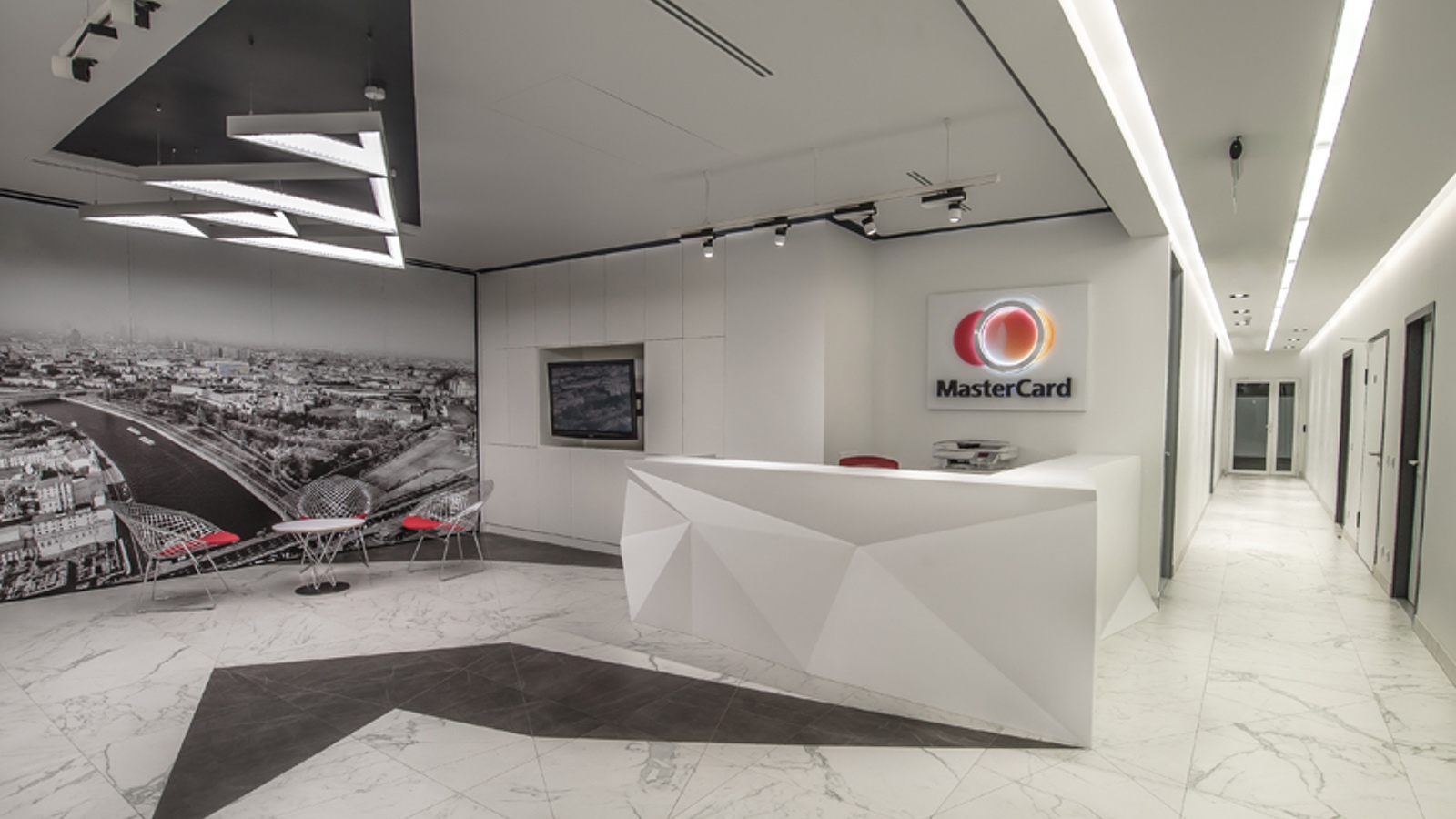 Работа над дизайн-концепцией нового офиса MasterCard началась с изучения внешних форм и базовой геометрии здания БЦ «Легенда цветного». Очертания архитектурного плана, трансформация простых форм в сложные, характерные для постройки в целом, стали основой интерьерного решения в стиле оригами. Образы, навеянные этой популярной конструктивной техникой, нашли оригинальное воплощение во внутреннем пространстве, состоящем из выразительных комбинаций ломаных линий и объемов. Характерный рисунок из пересекающихся плоскостей и линий повторяется в отделке стен и полов, задавая активный ритм и наполняя энергией рабочее пространство.
