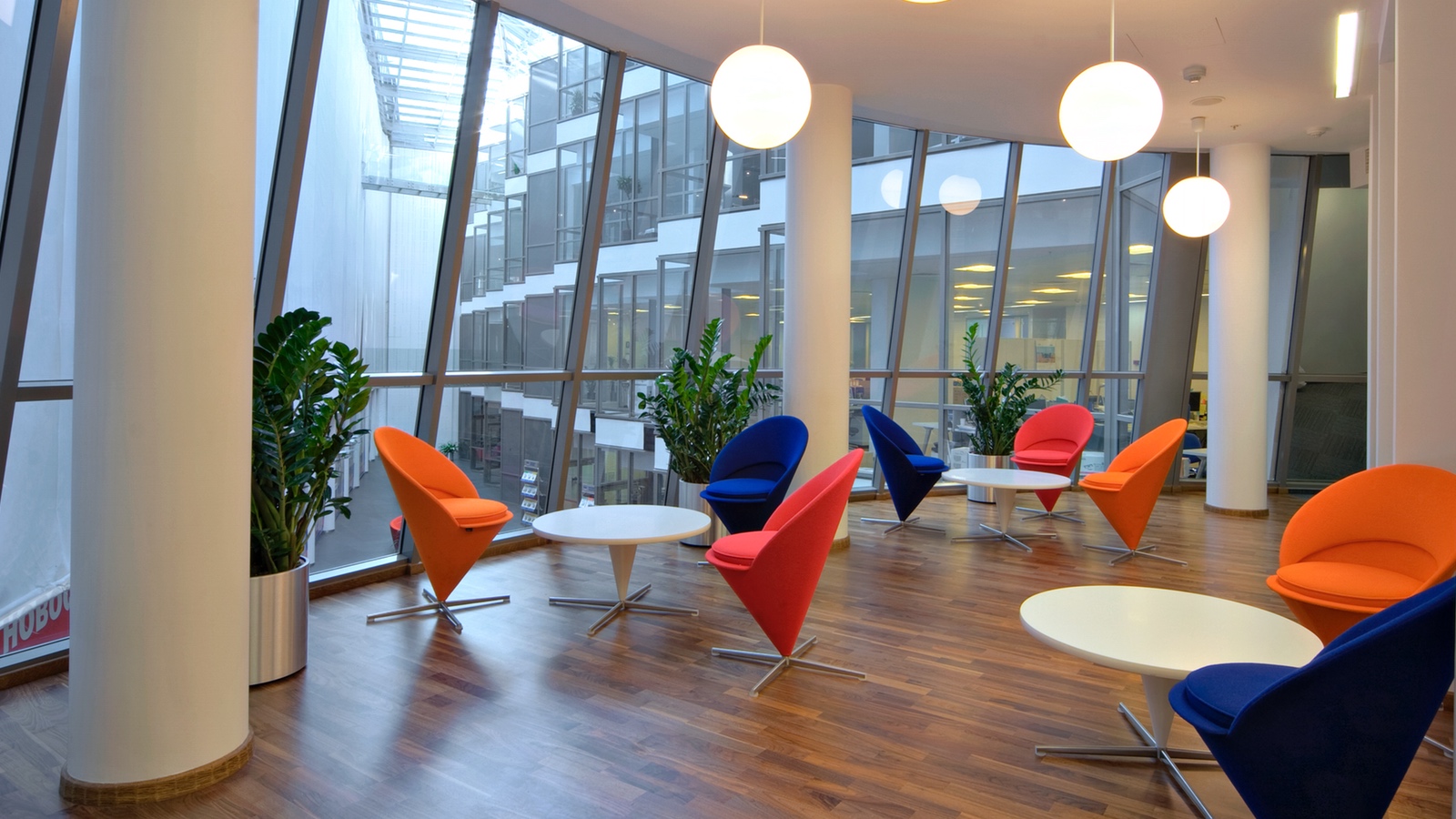 Рабочие места сотрудников оформлены в современном стиле, так же как и зоны отдыха на этажах. В то же время офисы руководителей на 5 и 6 этажах здания — более классические и уютные.