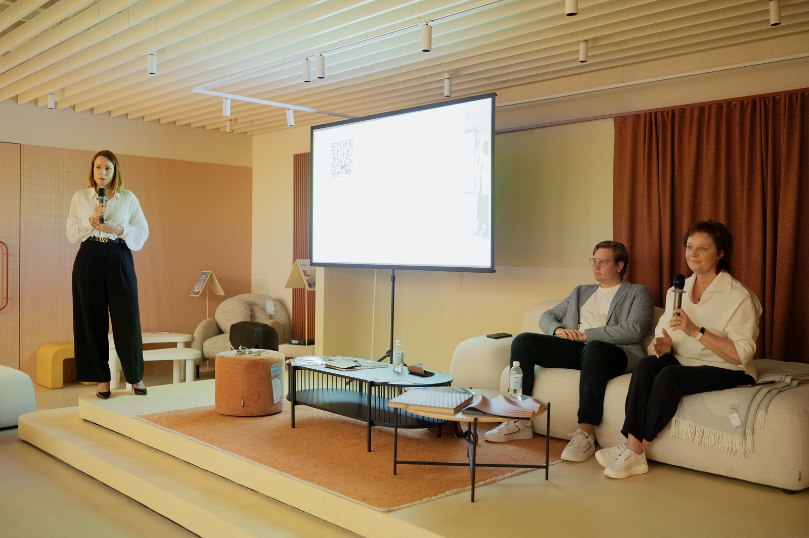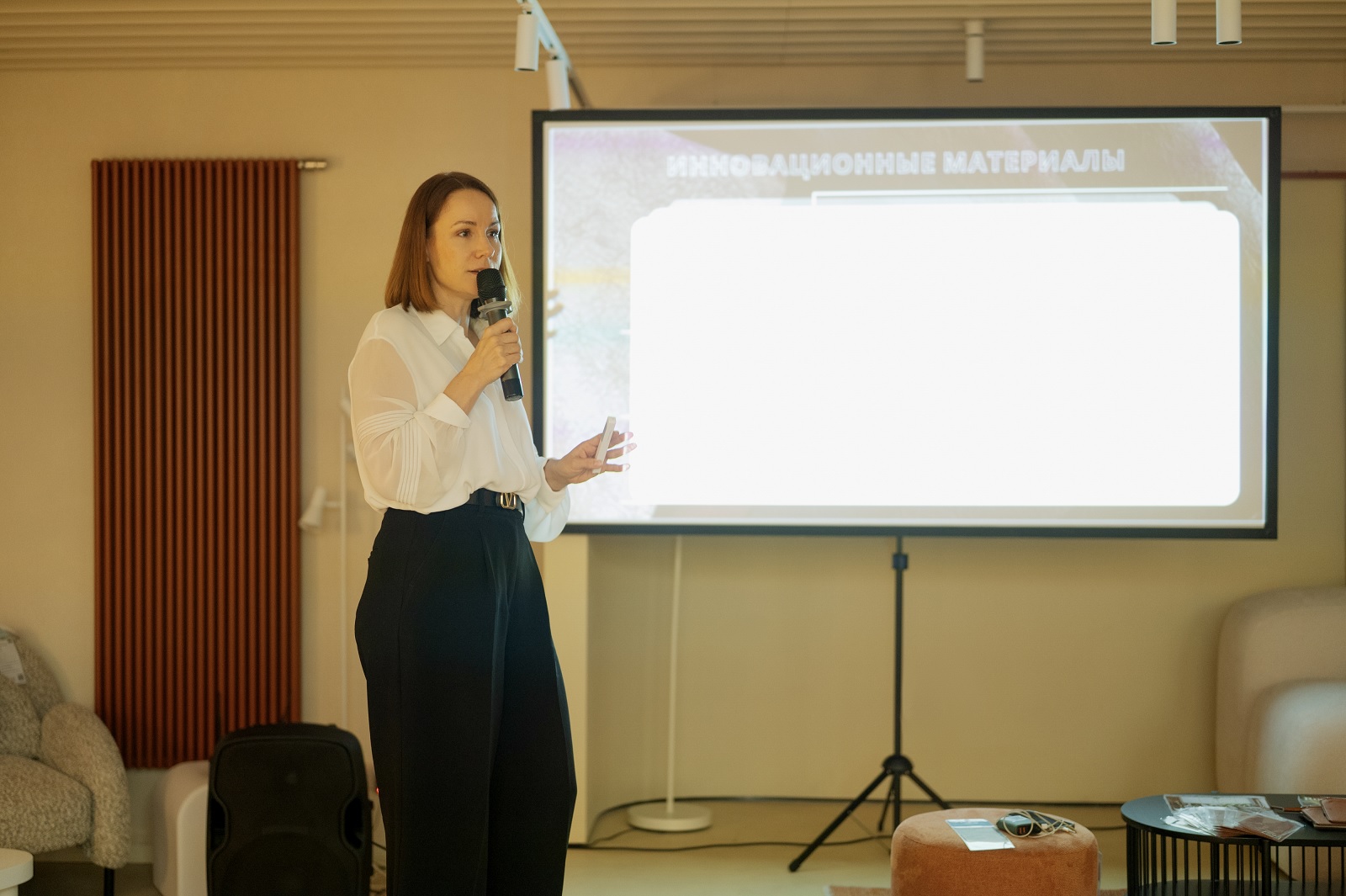 Спикеры мероприятия Артём Павлов и Татьяна Малофеева провели экспертную презентацию инновационной био-кожи, созданной на основе переработки яблок. Рассказали о технологии производства материала AppleSkin, преимуществах интерьерных решений с использованием этого экологически чистого продукта и важности продвижения экологичных и этичных материалов в дизайне.