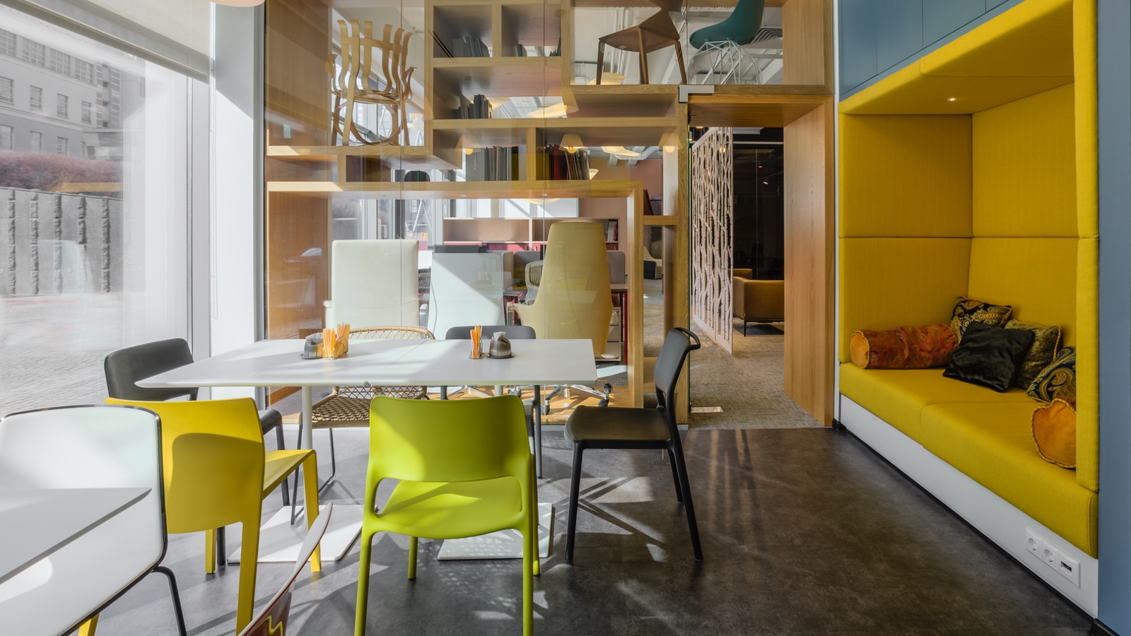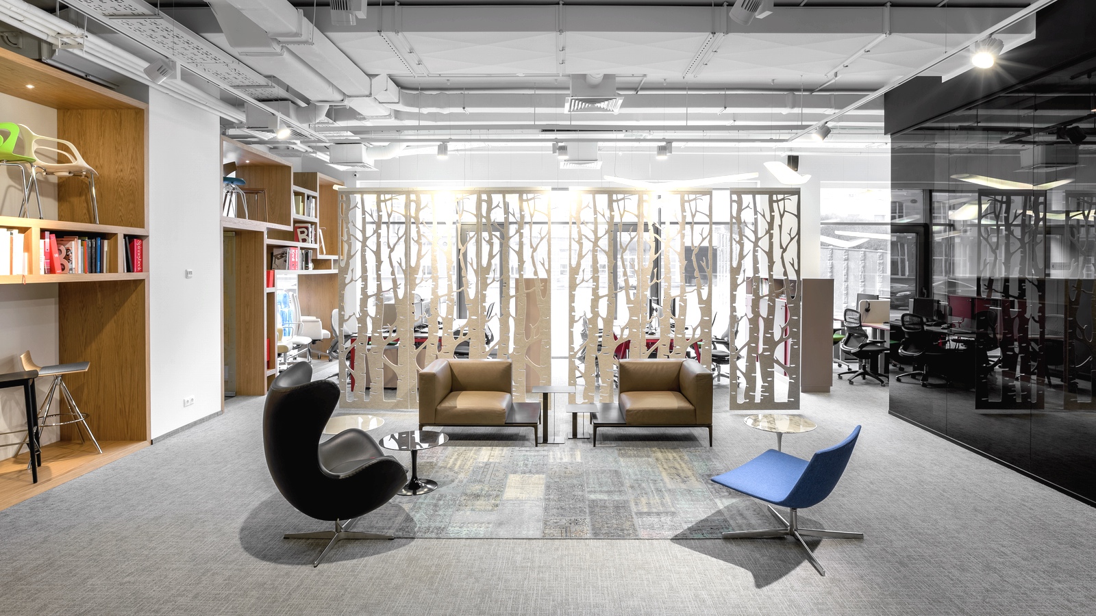 Но, пожалуй, самым ярким элементом обновленного интерьера является протянувшаяся вдоль всего офиса «стулотека» — стена с выставкой известнейших моделей кресел от крупнейших мебельных фабрик, а также многочисленными справочными материалами, призванными способствовать архитекторам в проектировании интерьеров.
