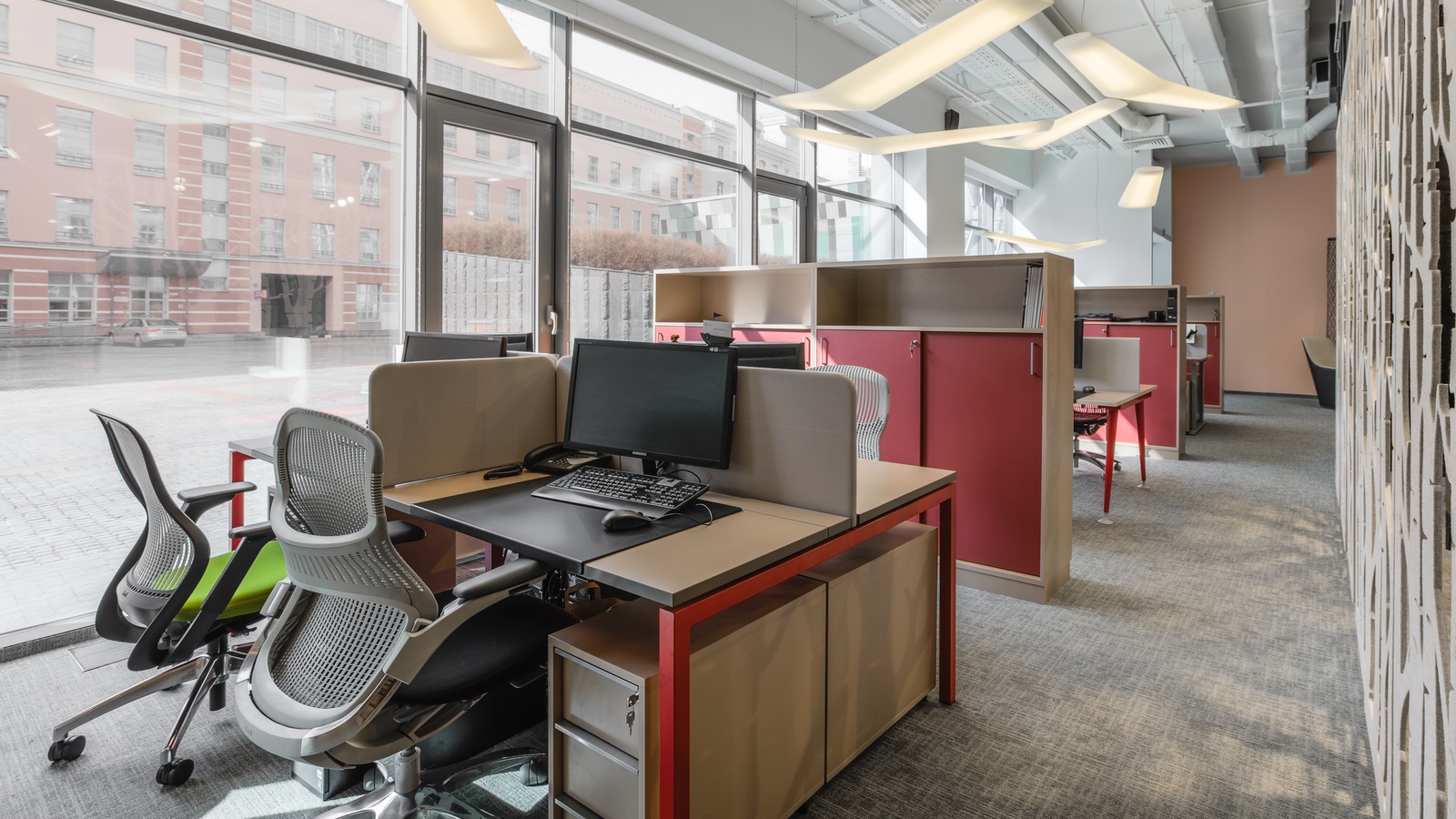 Рабочая зона сотрудников отделена фетровой перегородкой Buzzi.Space, которая прекрасно оптимизировала пространство благодаря своей способности пропускать воздух и свет. В столовой-кафе были добавлены такие элементы, как ниша-диван и классическая тумба с выставкой фотографий над ней, что позволило «одомашнить» интерьер.