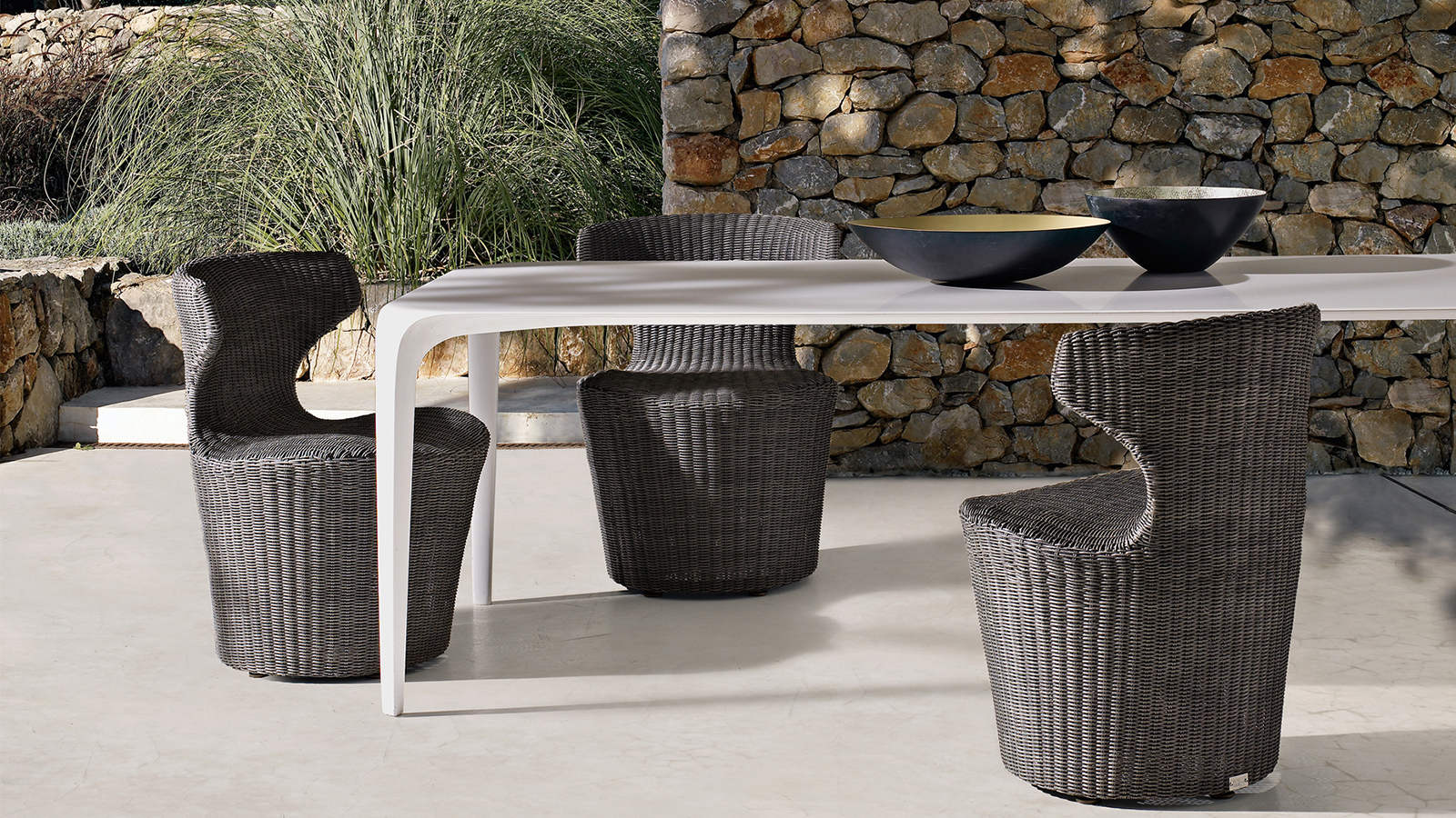 Кресла Papilio из коллекции садовой мебели Outdoor collection обладают обтекаемыми и гармоничными формами, как и остальные модели для закрытых помещений, однако, отличаются более легким внешним видом благодаря использованным для их изготовления материалам. Линейка Papilio производится в трех размерах: Grande Papilio, Piccola Papilio и Mini Papilio. Все три версии выделяются характерным для них очарованием единого материала, а также плетением из полиэтиленовых нитей темно-серого цвета, которое идеально обтекает их изгибы. Коллекция включает низкую скамеечку, которая повторяет полиэтиленовое плетение кресла Grande Papilio.