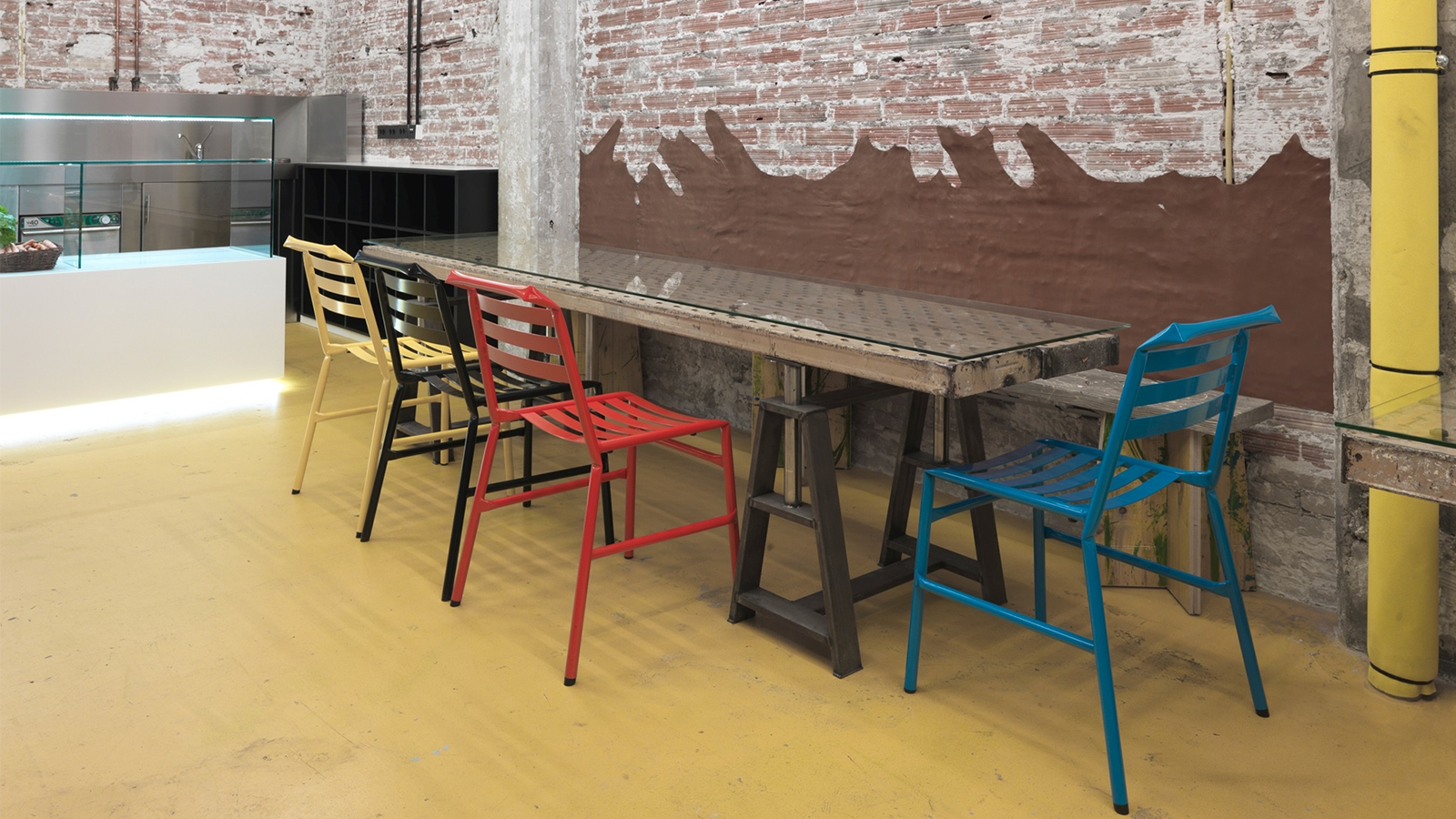 Коллекция Straw изготовлена из оцинкованной и лакированной «изломанной» трубчатой стали и имеет пластиковые ножки.