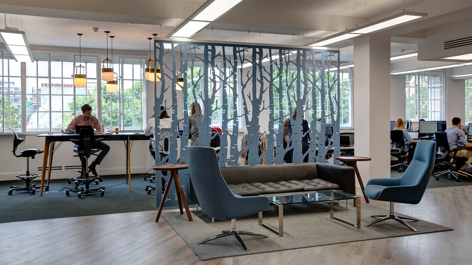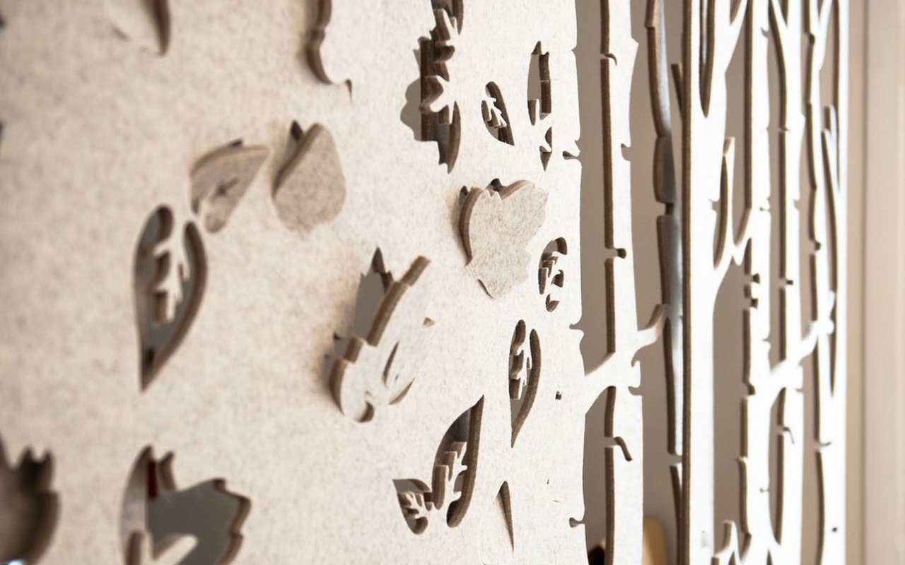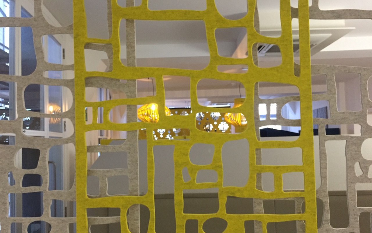 Пластины перегородки BuzziFalls сделаны из фетра с различными вырезанными узорами: от органики и геометрических фигур до городских очертаний. Акустическая панель BuzziFalls представляет собой оригинальное решение для обеспечения акустического комфорта и создания небольших зон в больших пространствах.