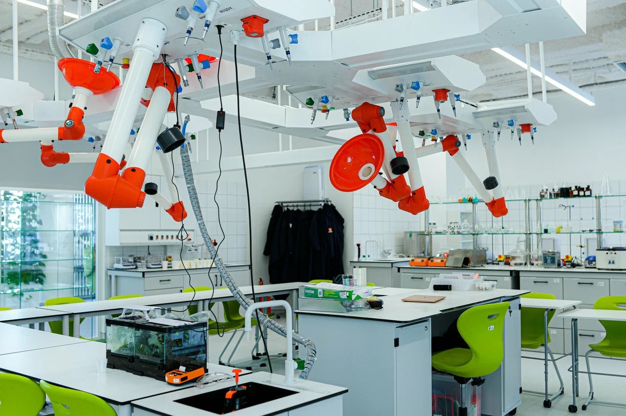 Специализированные мебельные системы для лабораторий, рабочие столы и стулья, вытяжные шкафы и мойки, сервисные модули (в том числе потолочные) и др.